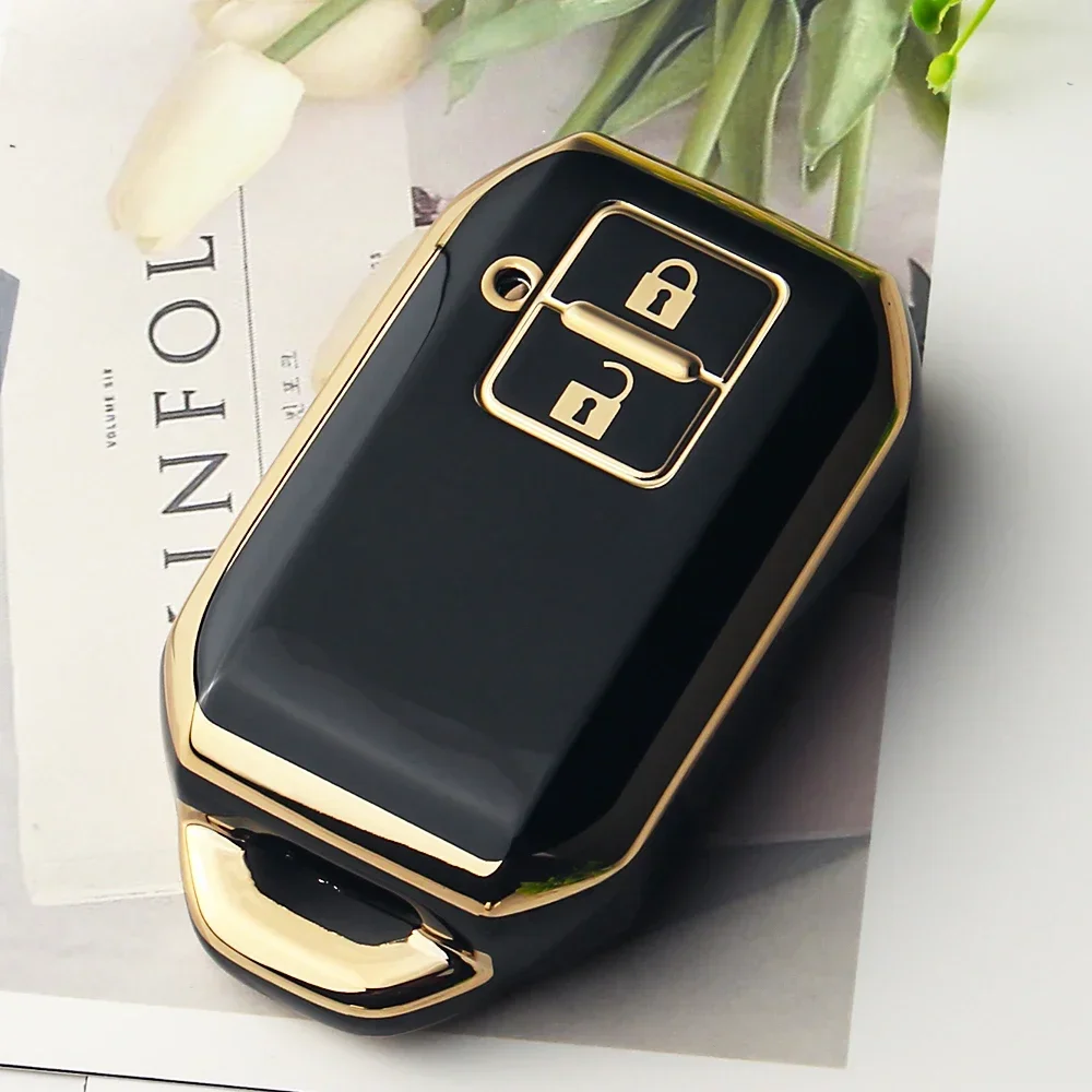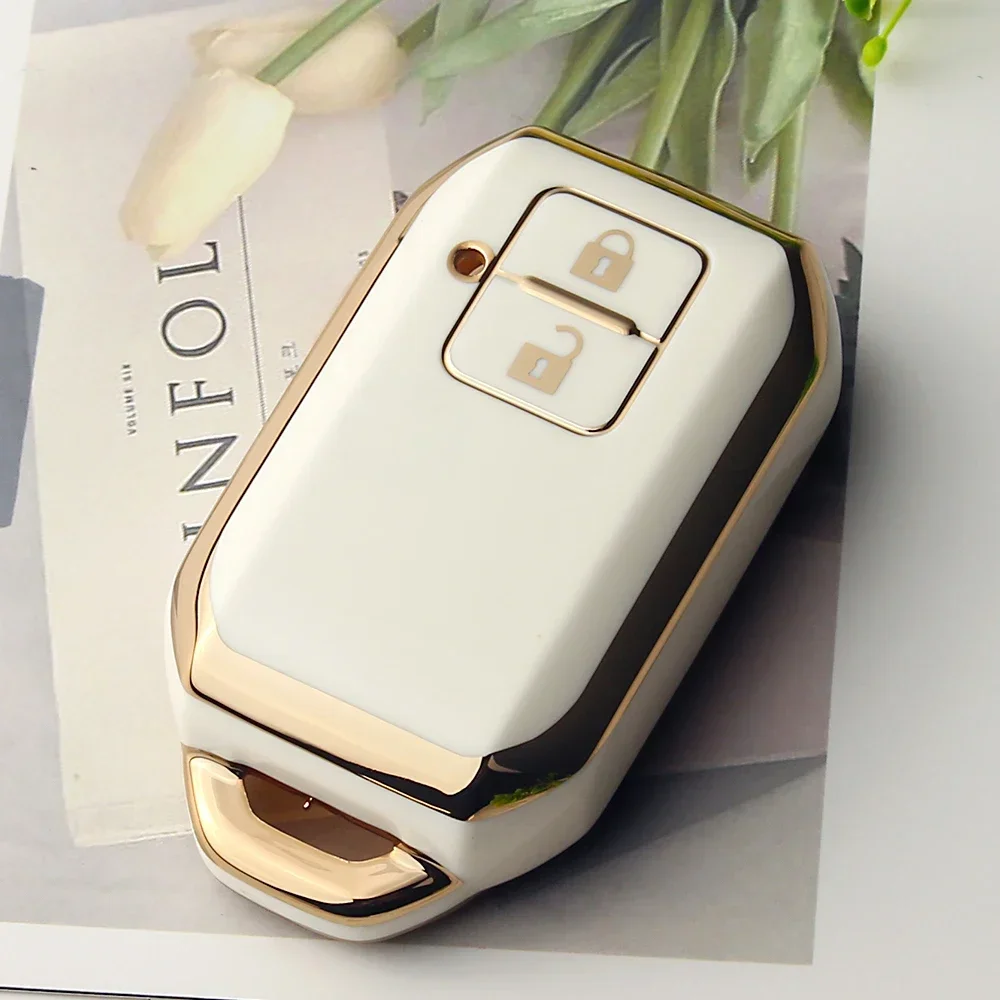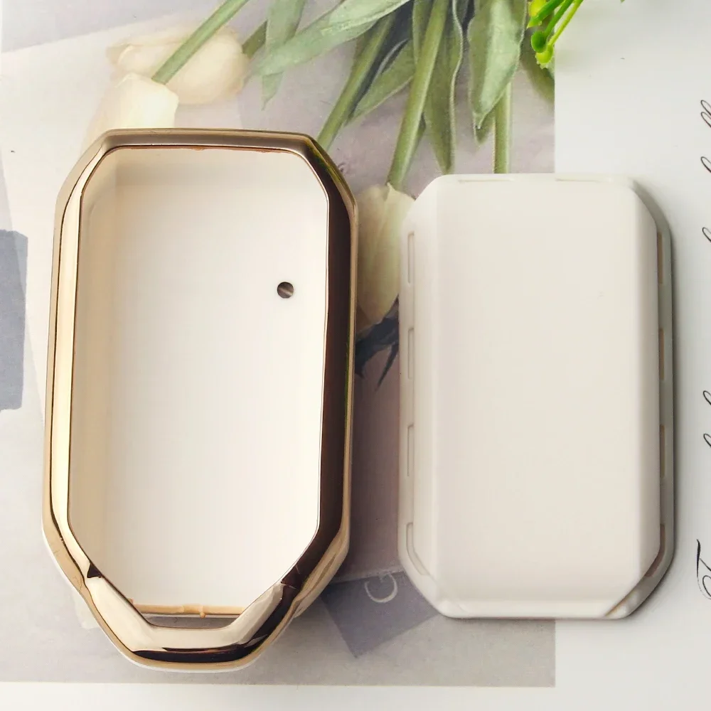 Elevate your car key experience with this set of luxurious TPU covers, designed to enhance both protection and style. Available in sleek black and elegant white, each cover features a glossy finish and a gold-colored metallic trim that adds a refined touch to your key fob. The modern rectangular shape with beveled corners provides a sophisticated look, while the recessed button areas with integrated lock and unlock symbols ensure ease of use. The small side holes allow easy attachment of keychains or lanyards, making your key both functional and fashionable. Made from durable TPU, these covers defend against scratches, cracks, dirt, wear, and water, maintaining their high-gloss appearance in various environmental conditions. Perfect for enhancing your key's elegance and longevity.