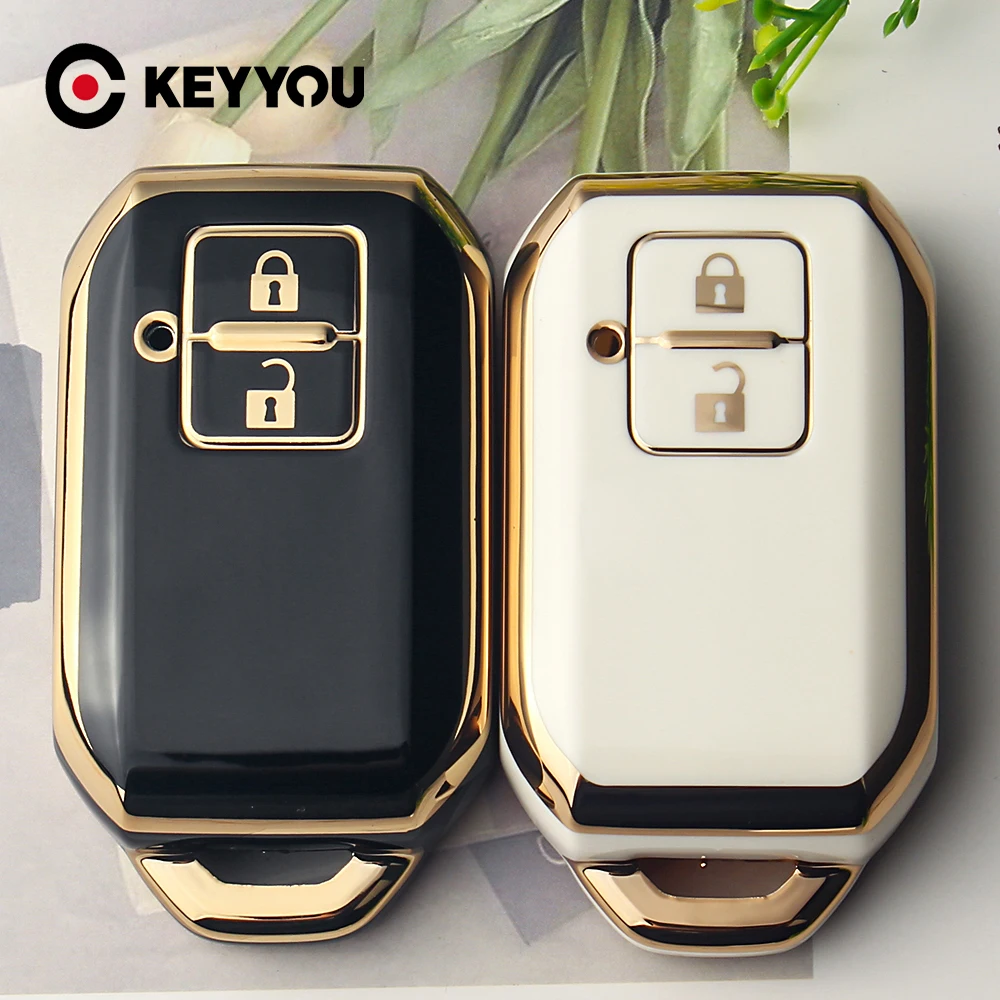 - The set includes two covers in contrasting colors—black with a polished glossy finish and gold trim, and white with matching gloss and elegance—adding a luxurious look to your key fob.