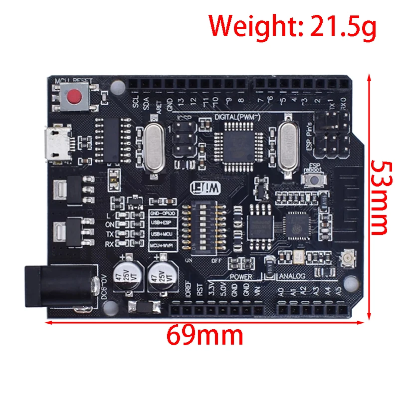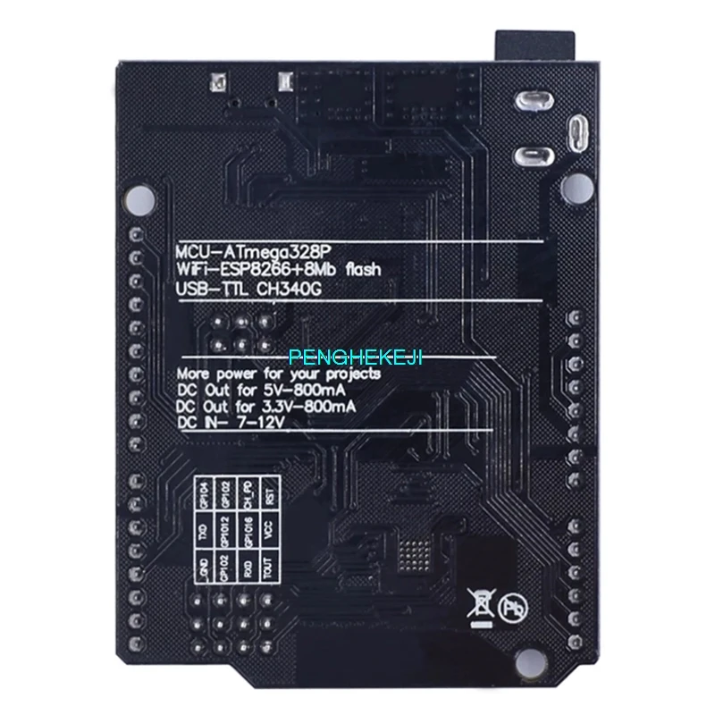 Experience advanced development with this sleek black rectangular board featuring an integrated ATmega328P microcontroller and a 32MB ESP8266 WiFi module. Supporting a supply voltage of 6V to 9V and equipped with a USB-TTL CH340G interface for easy programming, this versatile platform is ideal for creating WiFi-enabled projects. Its minimalist design showcases silver components and neatly labeled headers, combining technical precision with a modern aesthetic. Perfect for electronics enthusiasts and professionals alike, this development board offers customizable configurations, making it a reliable choice for connecting sensors, modules, and developing innovative IoT solutions.