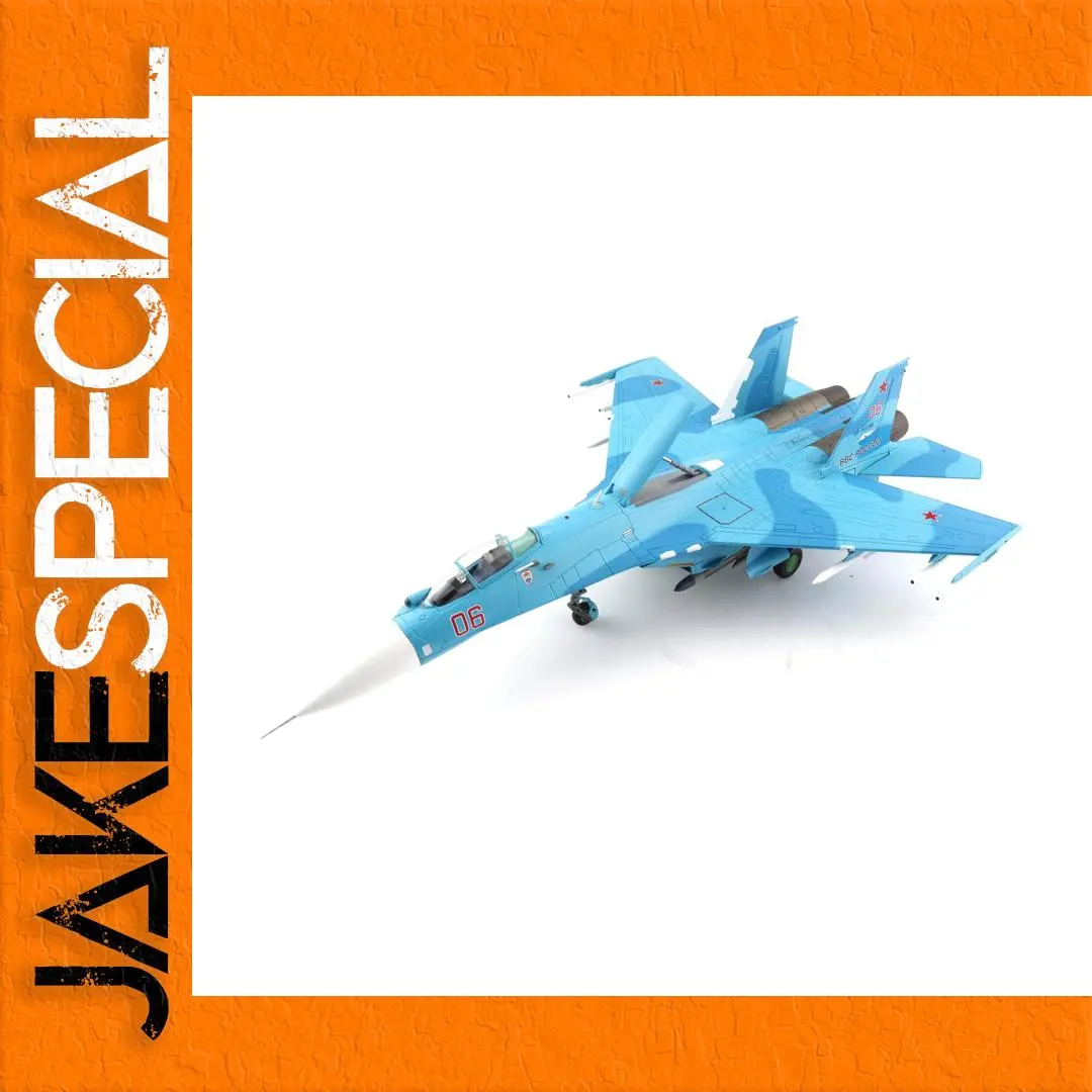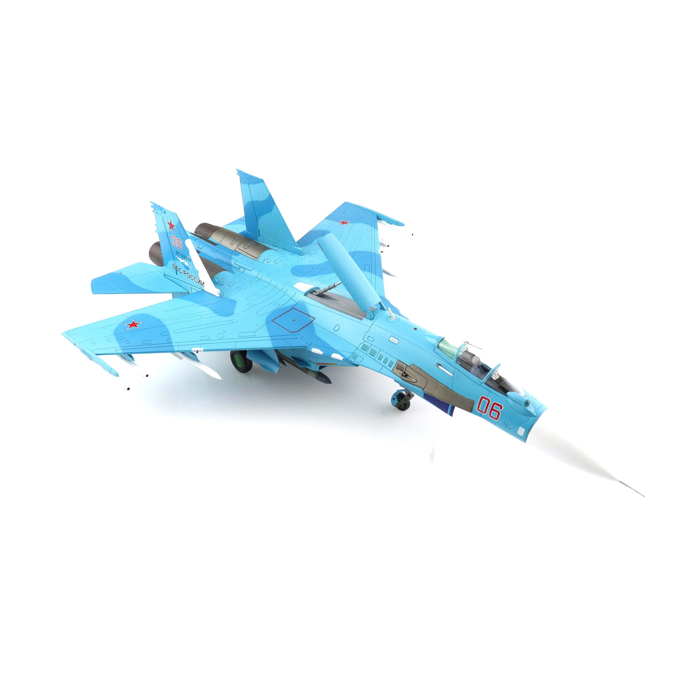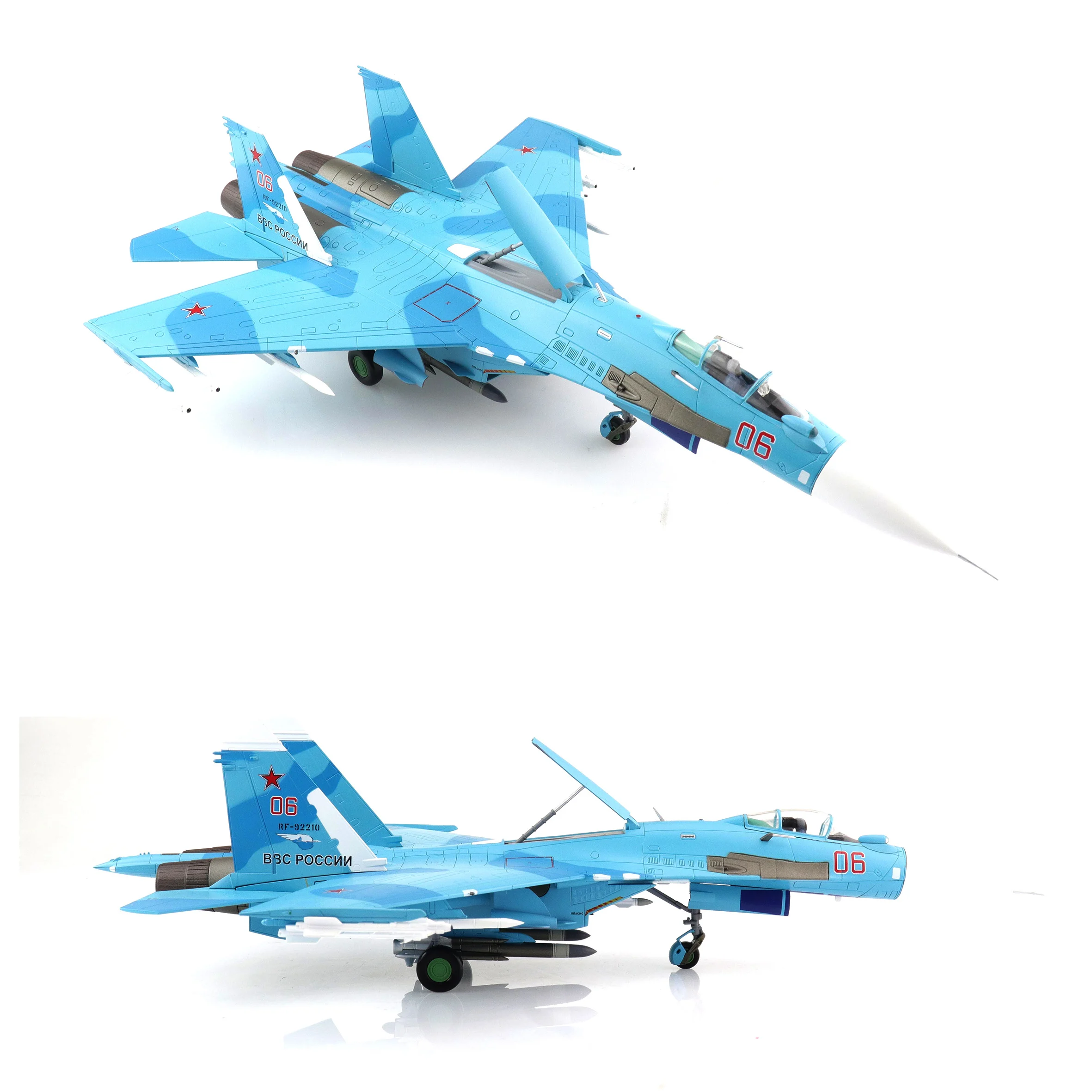Imagine proudly displaying this stunning 1:72 scale diecast model of the Russian Su-27SM fighter jet, specifically the iconic Red 06/RF-92210 version. Crafted with vibrant sky blue tones and a glossy finish, this detailed model features striking contrasts, including the prominent red “06” on the fuselage and the signature red star emblem on its wings, showcasing its rich heritage within the Russian Air Force. Measuring approximately 31 cm in length with a wingspan of around 21 cm, this collectible will undoubtedly capture the attention of any aviation enthusiast or model collector. Each aerodynamic detail—from the pointed nose cone to the intricately designed canards—contributes to its overall realistic presentation.