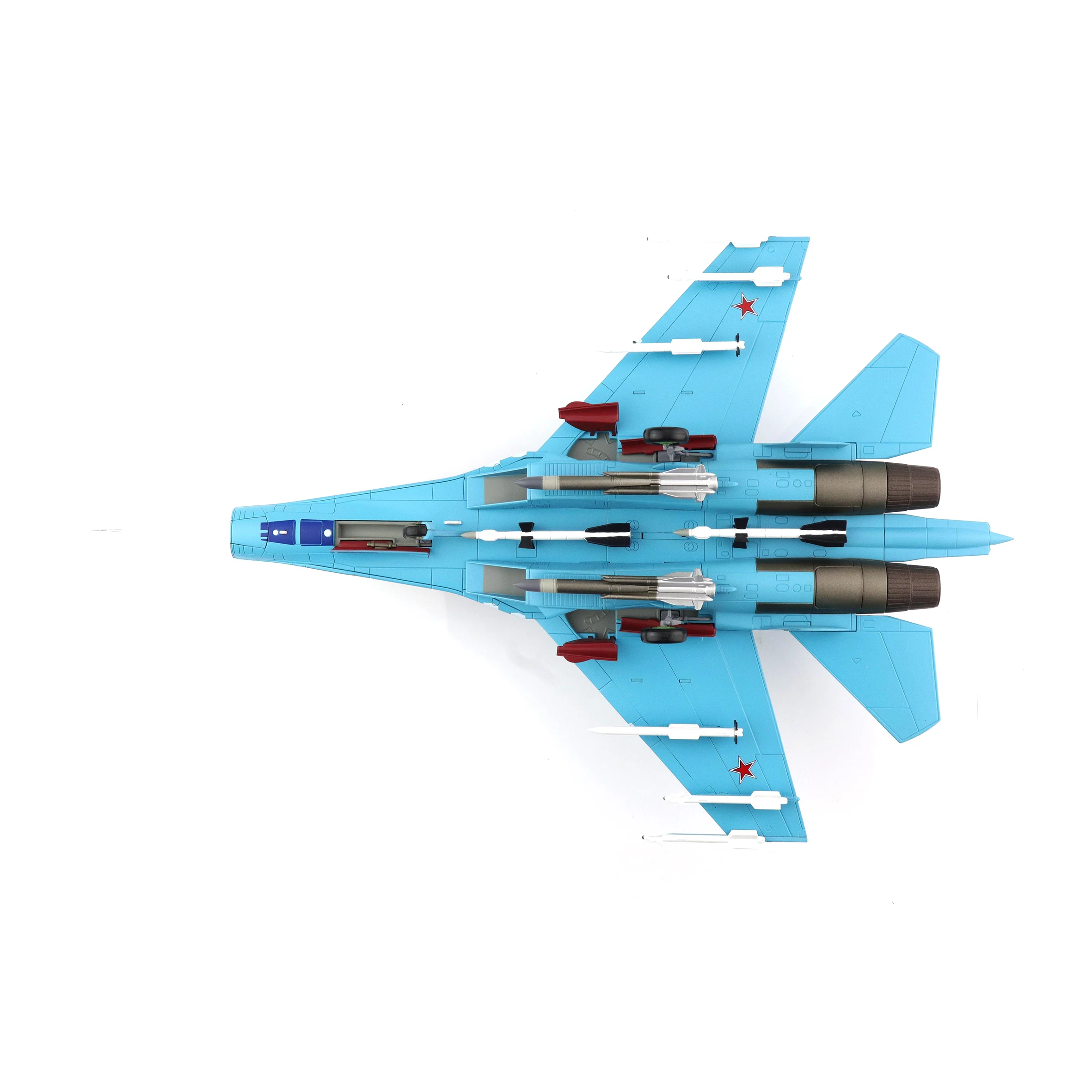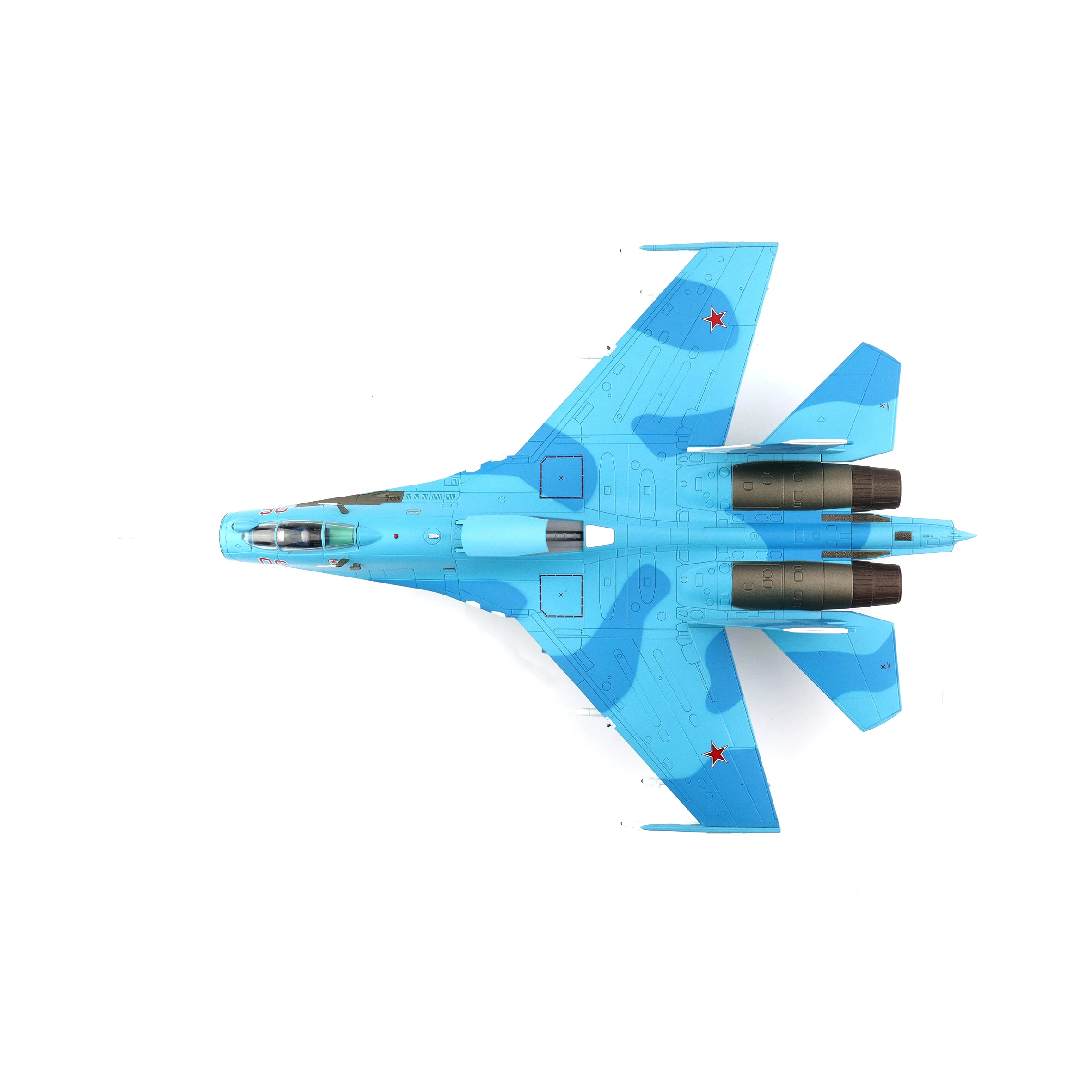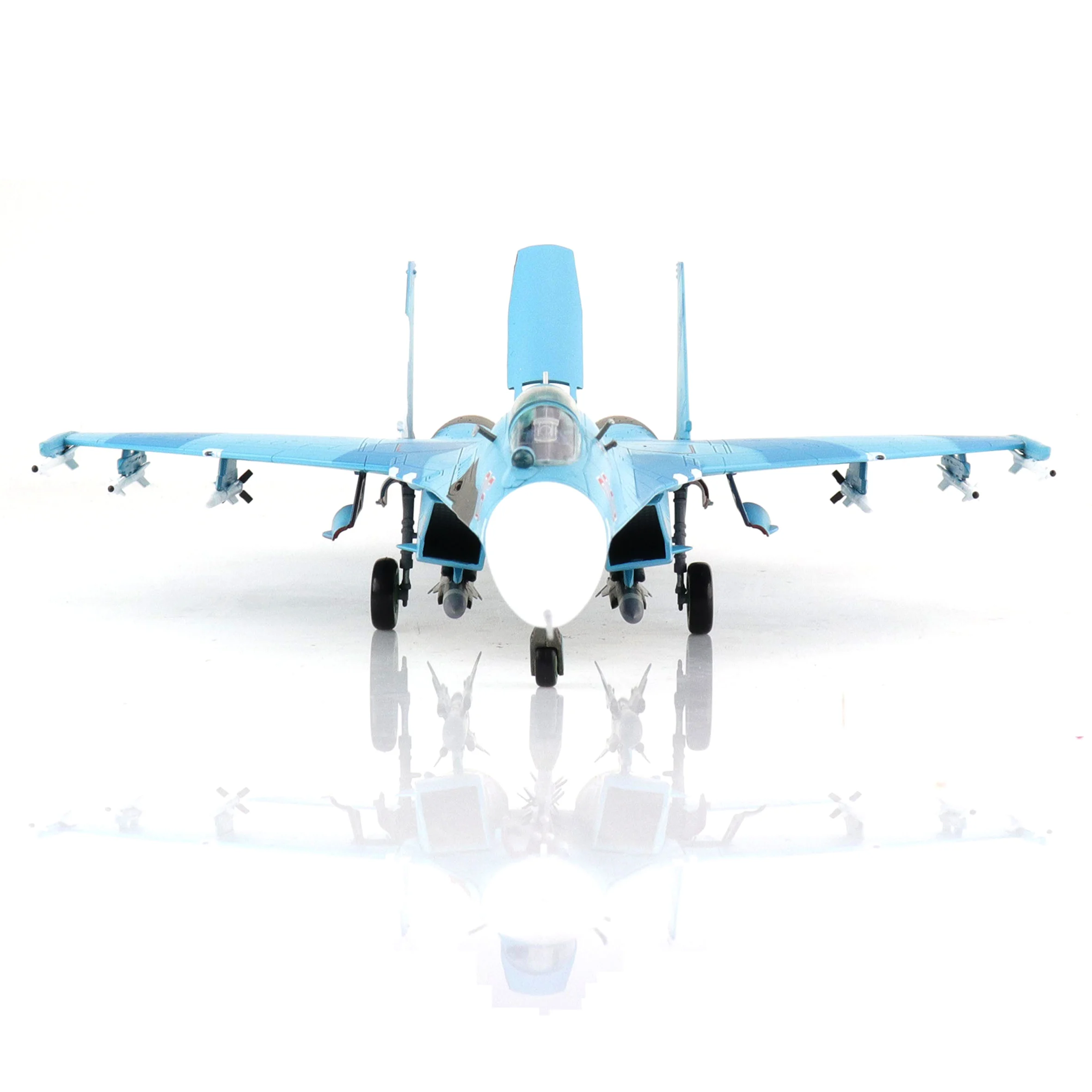 Imagine proudly displaying this stunning 1:72 scale diecast model of the Russian Su-27SM fighter jet, specifically the iconic Red 06/RF-92210 version. Crafted with vibrant sky blue tones and a glossy finish, this detailed model features striking contrasts, including the prominent red “06” on the fuselage and the signature red star emblem on its wings, showcasing its rich heritage within the Russian Air Force. Measuring approximately 31 cm in length with a wingspan of around 21 cm, this collectible will undoubtedly capture the attention of any aviation enthusiast or model collector. Each aerodynamic detail—from the pointed nose cone to the intricately designed canards—contributes to its overall realistic presentation.