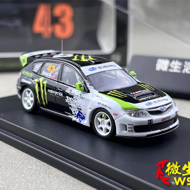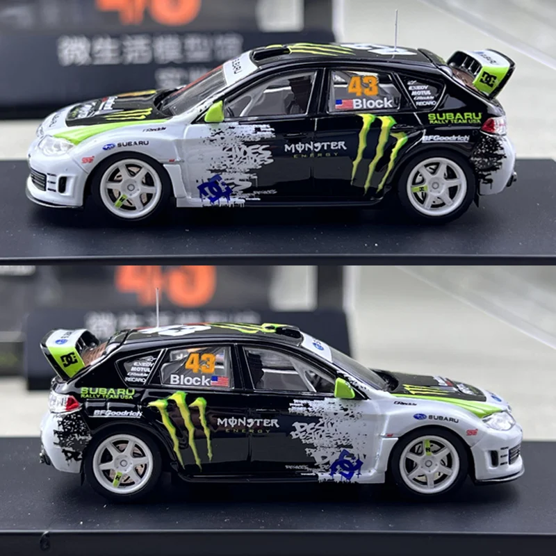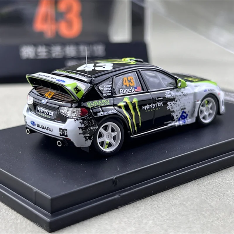 Immerse yourself in the world of motorsport with this highly realistic die-cast model of the Subaru Impreza WRX STI #43 driven by Ken Block. Crafted by Takara Tomy, this 1:64 scale replica captures the car's sleek, sporty design with meticulous attention to detail. Its vibrant white body features bold black accents on the roof, hood, and sides, complemented by eye-catching lime green highlights and sponsor logos such as Monster and Crankfor, adding a dynamic touch. The shiny, metallic finish enhances its collectible appeal, while the aerodynamic elements like the front splitter, side skirts, and rear spoiler emphasize its high-performance character. With transparent windows revealing impressive interior details, this model truly embodies the thrill of rally racing.