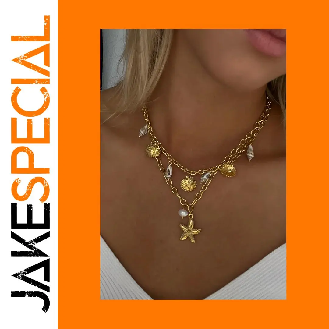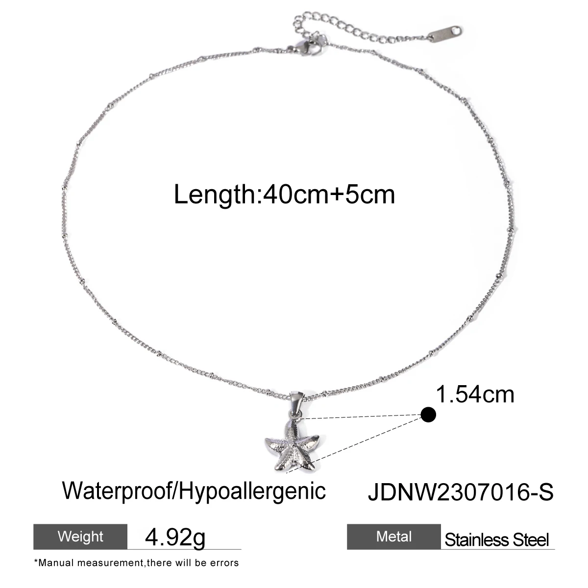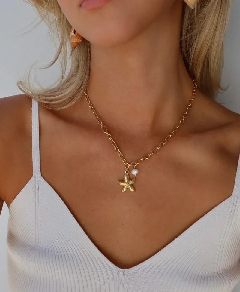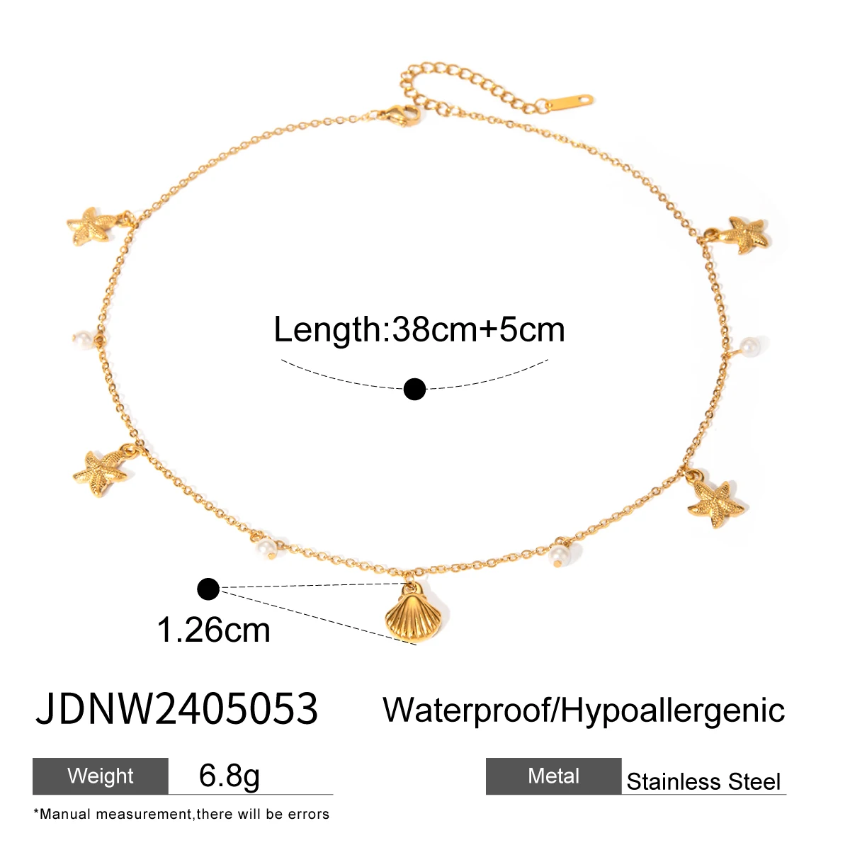 Experience the charming allure of this trendy and chic beach-inspired necklace, perfect for adding a touch of seaside elegance to your casual or party outfits. Crafted from durable stainless steel with a PVD gold coating, this unisex jewelry piece boasts a textured starfish pendant and complementary sea-themed charms. Its shiny, polished finish gleams beautifully, capturing the essence of summer waves and sandy shores. Weighing just 15 grams, it offers comfortable wear and long-lasting quality, being waterproof and resistant to scratches. Whether you're dressing up for a special occasion or just embracing a relaxed, nautical look, this necklace brings a stylish, summery vibe that will elevate your ensemble effortlessly.