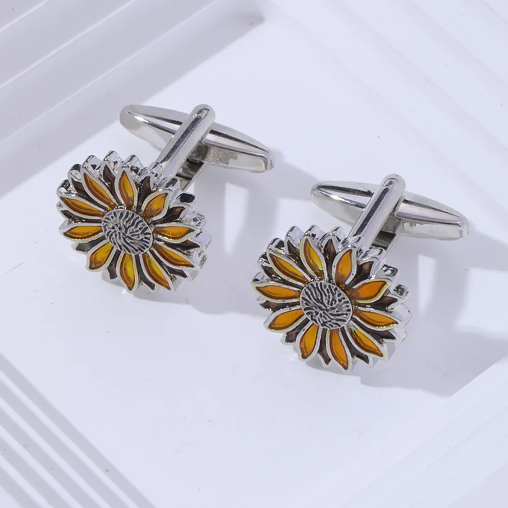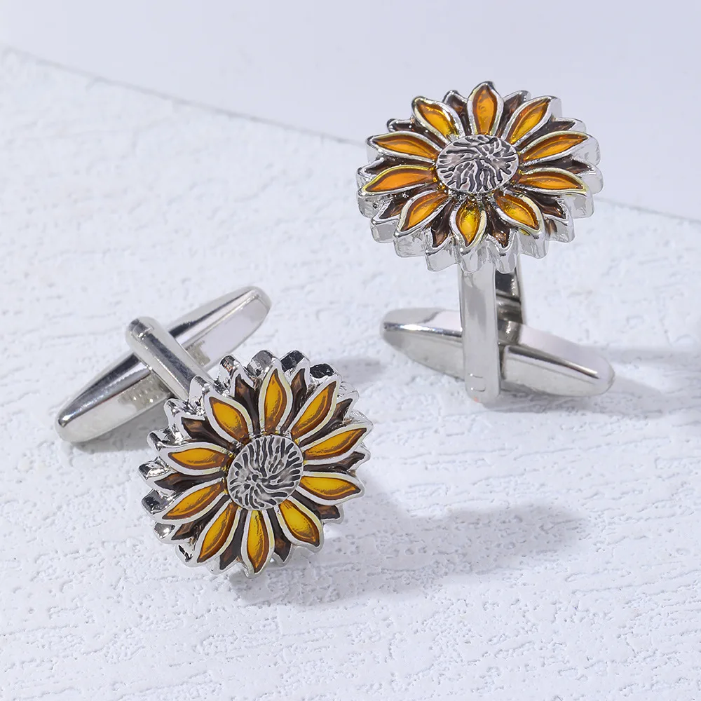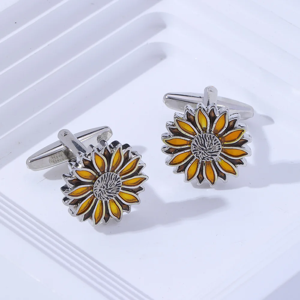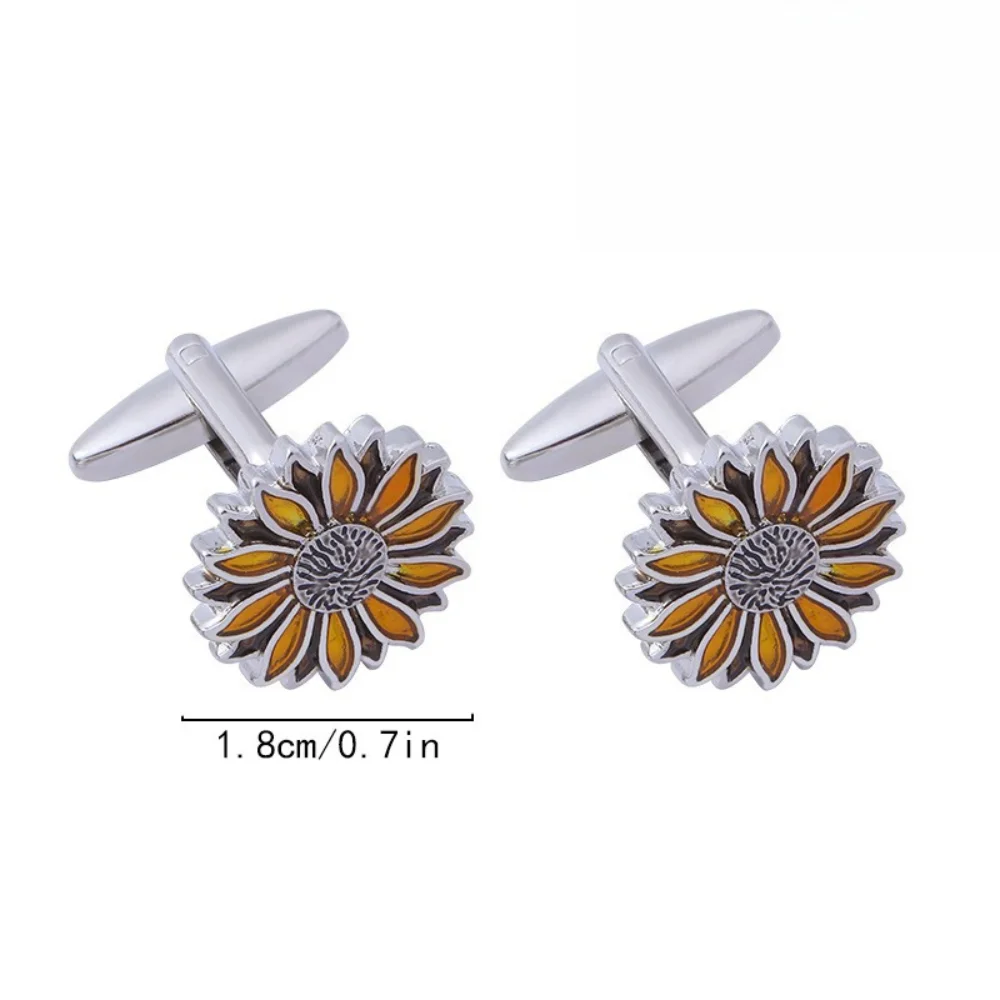 - Unisex alloy cufflinks featuring a vibrant sunflower design with three-dimensional petals and golden-yellow enamel accents.