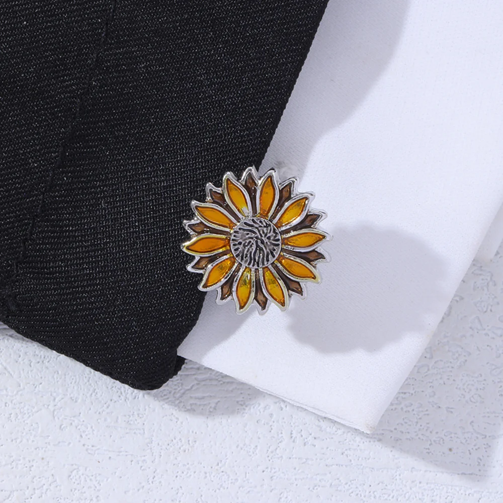 Imagine elevating your style effortlessly with these exquisite sunflower enamel cufflinks. Crafted from alloy, these unisex accessories feature a vibrant three-dimensional sunflower design with detailed petals highlighted in bright golden-yellow enamel. The polished silver-tone finish brings a sleek, reflective surface, perfect for both casual and formal occasions. Whether paired with a suit, shirt, or DIY fashion project, these cufflinks add a touch of vintage charm and lively floral imagery to your wardrobe. The textured central core with darker enamel accents highlights craftsmanship and attention to detail. Designed with versatility in mind, they are suitable for jackets, backpacks, hats, or custom outfits, making them a unique and eye-catching accessory to showcase your personality and sense of style.