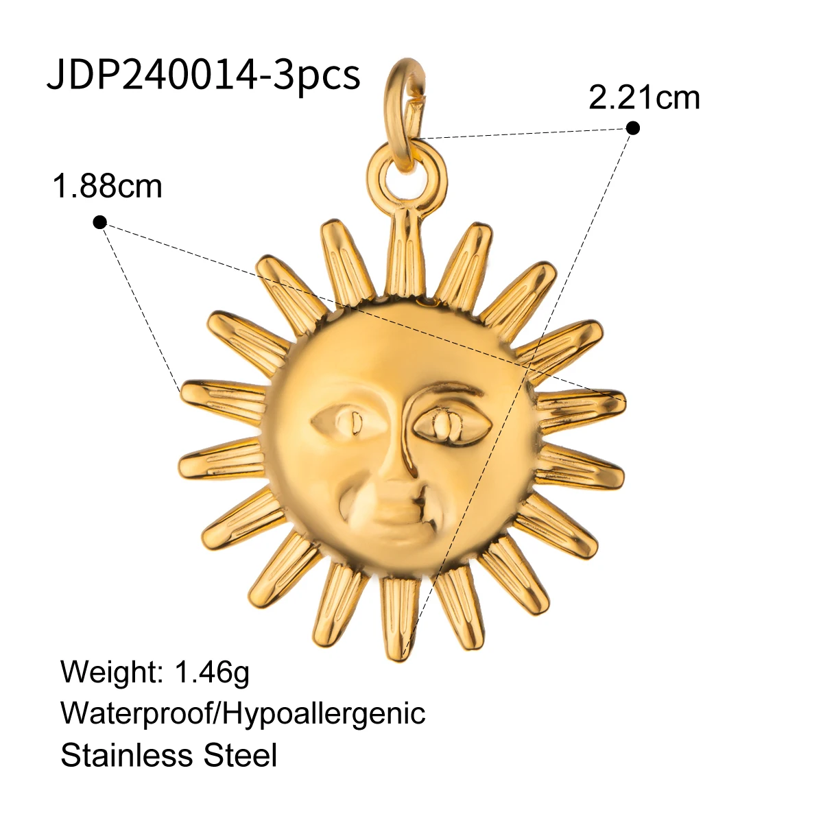 Enhance your jewelry creations with this set of three stainless steel sunflower charms, featuring a durable PVD gold finish for a long-lasting, anti-scratch, and waterproof surface. Each charm, available under model numbers such as JDPW240033-3pcs, JDP24004-3pcs, JDP24005-3pcs, JDPW240013-3pcs, JDPW240015-3pcs, JDPW240016-3pcs, JDPW240017-3pcs, JDPW240041-3pcs, and JDPW240045-3pcs, showcases intricate textured details, including sunflower petals and center, scalloped borders, ridged shells, and more. Perfect for designing personal necklaces, bracelets, or earrings, these nickel, lead, and cadmium-free charms combine elegant aesthetics with toughness, inspiring you to craft unique, luxurious accessories with confidence.