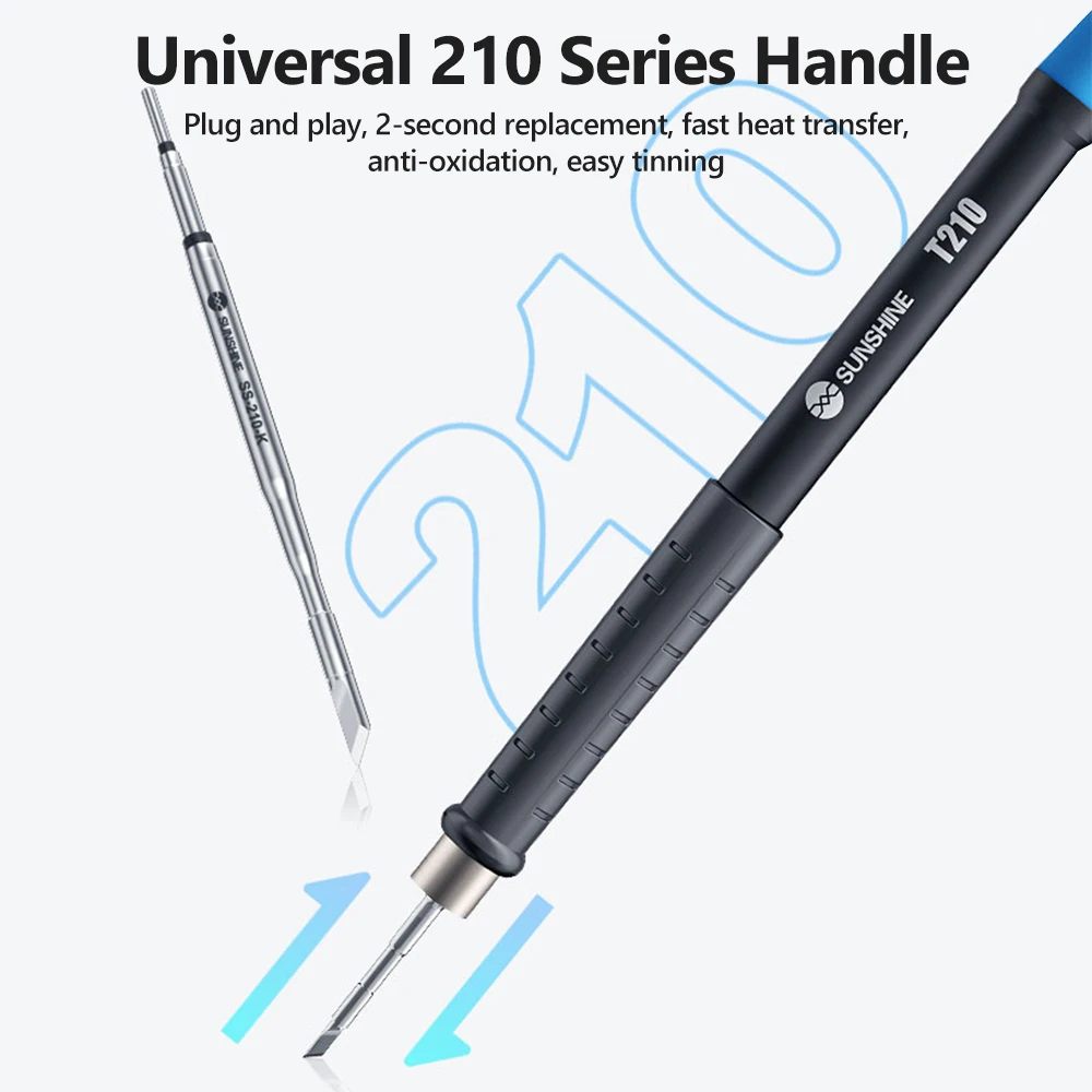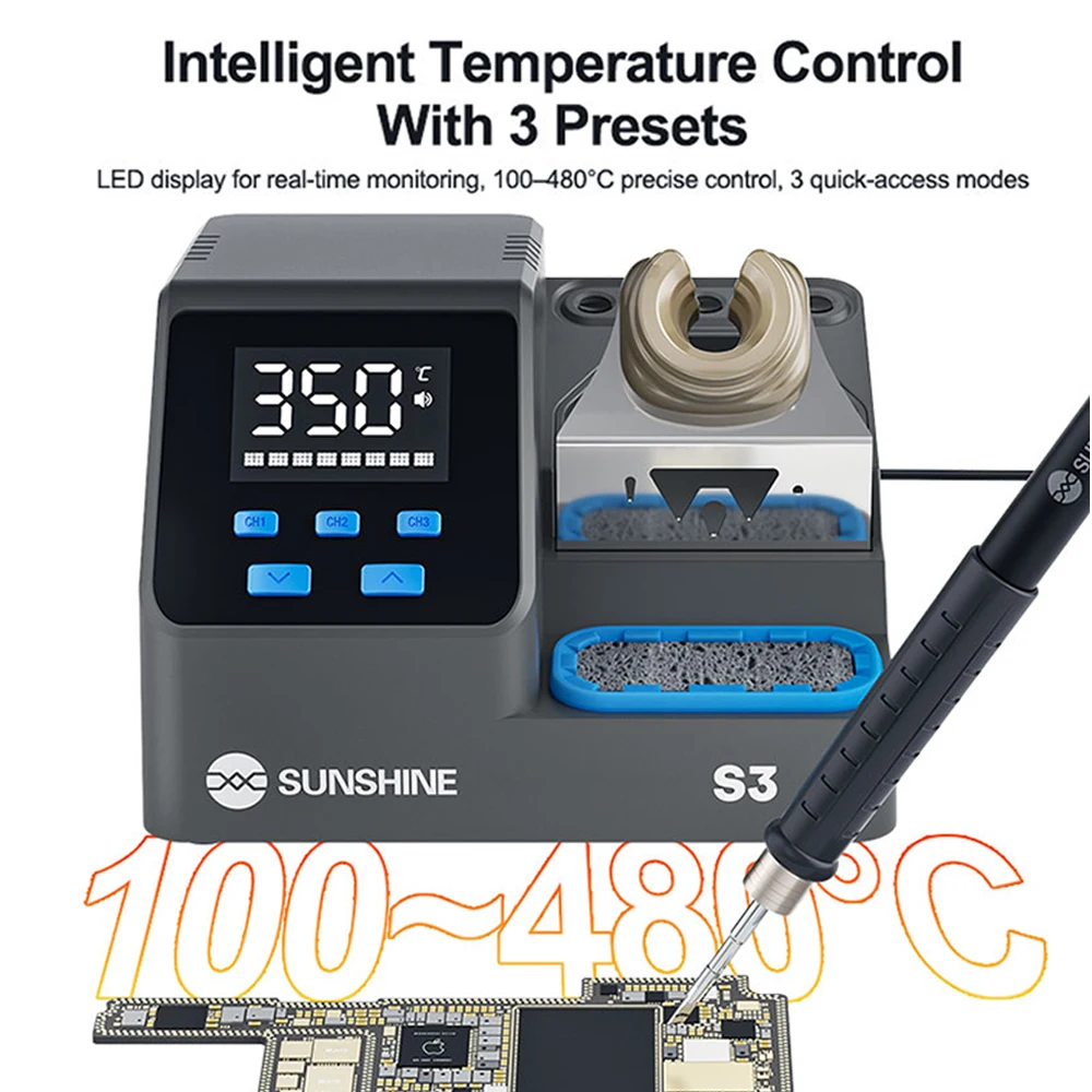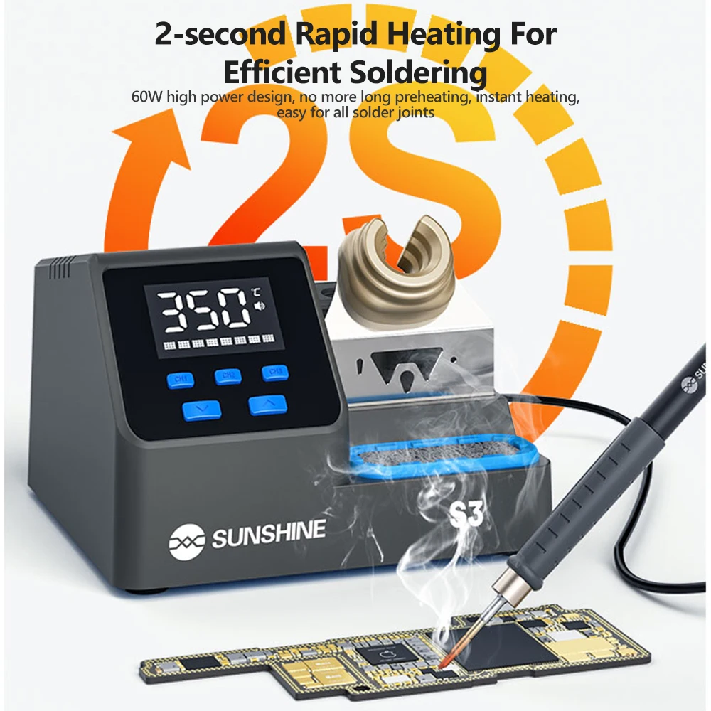 Experience precise and efficient soldering with the SUNSHINE S3 210 Smart Soldering Station, a compact and modern tool designed for mobile phone and electronic component repairs. Featuring a rapid 2-second heat-up time, adjustable temperature range from 100°C to 480°C in ±5°C increments, and a powerful 60W operation, this station offers three customizable channels and digital temperature calibration for perfect results. Its ergonomic gray handle with textured grip, built-in tip storage, cleaning sponge, and LED power bar make your workflow seamless. Operating on AC 110-240V, this sleek station combines intelligent energy-saving features with professional-grade performance, ideal for both technicians and enthusiasts.
