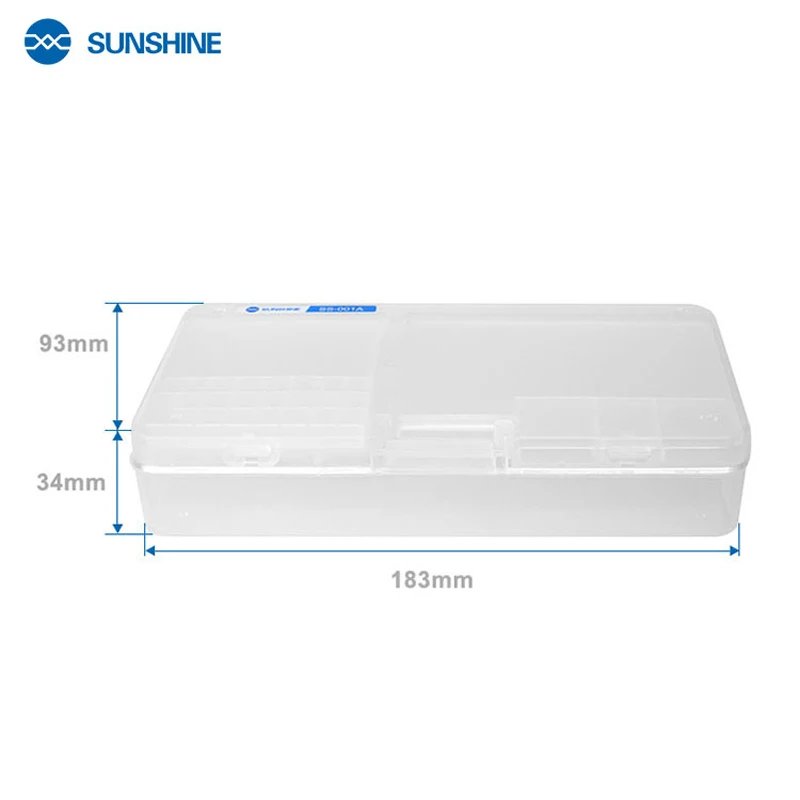 Imagine organizing your mobile repair workspace with ease using this sleek, clear storage solution. The SUNSHINE SS-001A double-layer storage box offers a practical way to keep small components like screws, IC chips, and motherboards separated and secure. Its transparent PVC material makes identifying contents quick and effortless, saving you valuable time during repairs. The sturdy design features two layers, each with its own lock, ensuring a tight closure to prevent any accidental spills. The upper layer is divided into small compartments, perfect for tiny parts, while the lower layer accommodates larger items such as whole mobile phones. Its compact size (183 x 93 x 34mm) makes it portable without sacrificing storage space. This durable, reusable container is ideal for professional technicians or enthusiasts alike.