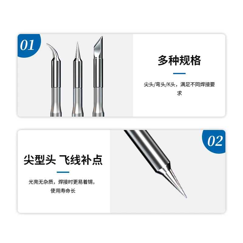 Enhance your soldering precision with this set of three high-quality tips compatible with GVM T210 soldering stations, including models SS-C210-K, SS-C210-IS, SS-C210-I, and a versatile 3-in-1 option. Crafted by SAYTL, each tip features a polished, durable metal finish with distinct shapes: a fine, curved pointed tip for detailed work, a sharply conical tip for tight-space precision, and a broad, flat chisel tip for heavier tasks. Designed for universal fit with C210 welding stations, these tips combine sleek aesthetics with exceptional functionality, ensuring reliable performance for a variety of soldering applications.