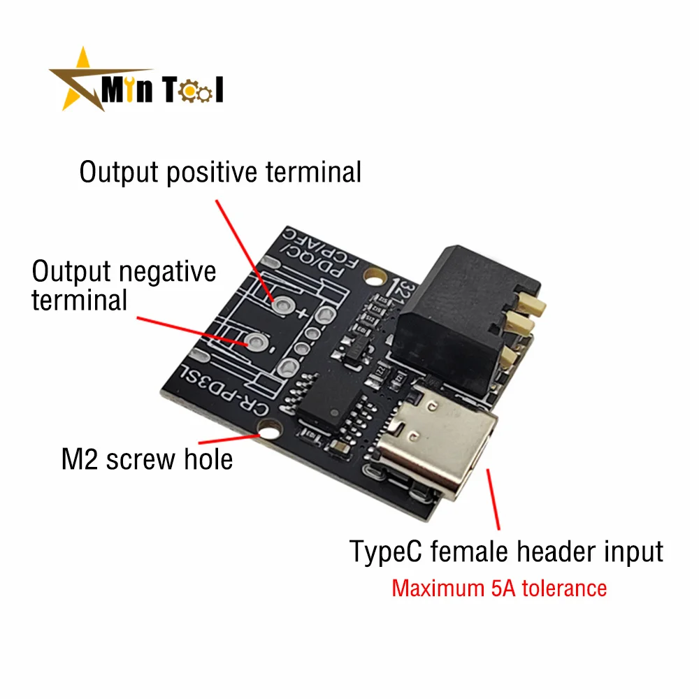 Experience seamless integration with this support trigger decoy device designed for quick and efficient power supply testing. Crafted for DIY enthusiasts and tech professionals, this compact module measures just 25mm by 23mm, making it perfect for tight spaces and innovative projects. Its sleek black design with white labeling highlights its precise engineering. Multiple support protocols like PD2.0, 3.0, QC2.0, and AFC allow for versatile compatibility with various devices. The onboard LED indicator provides easy status monitoring, while the DIP switch enables simple voltage adjustments from 5V up to 20V. Its robust M2 screw holes ensure secure mounting, making it durable for repeated use in different environments. This device is an essential tool for testing, modification, and troubleshooting in high-tech power applications.