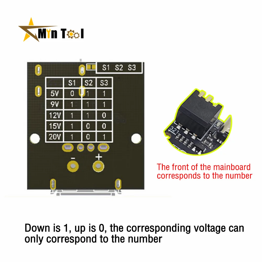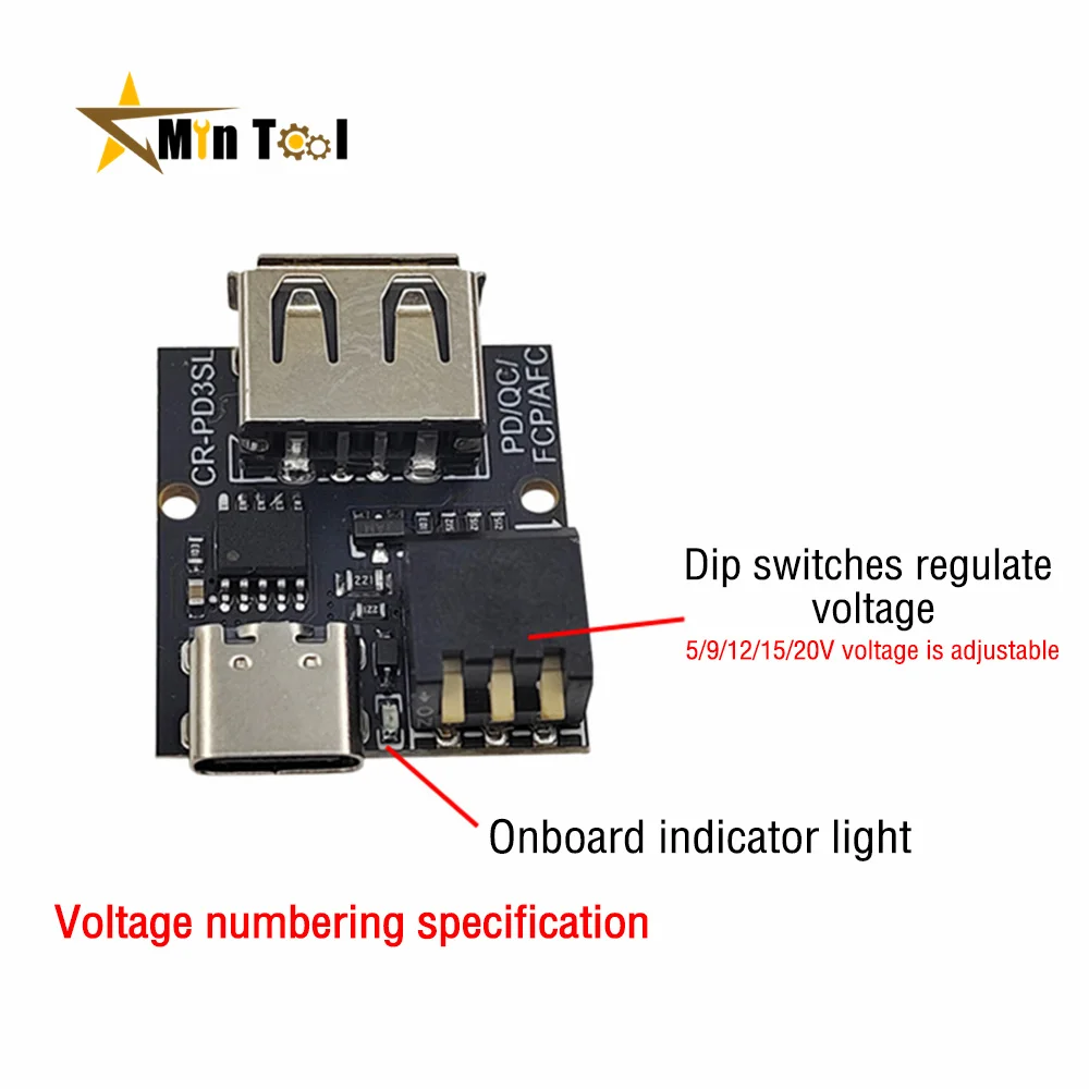 - Equipped with a Type-C female input supporting up to 5A, optional USB output, an onboard indicator light, and a DIP switch to easily control voltage settings and enable quick adjustments during use.