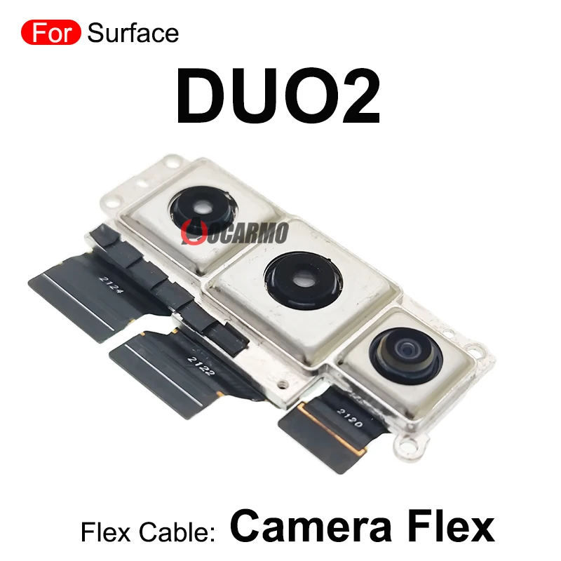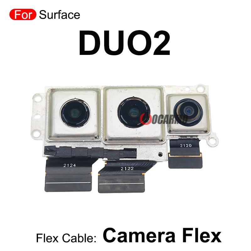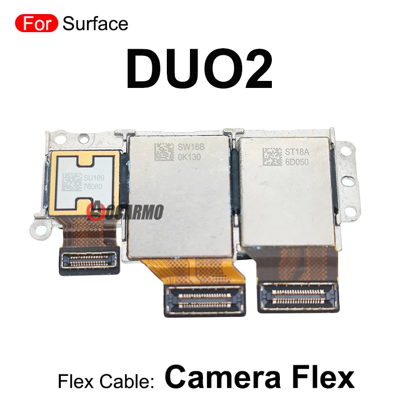 Enhance your device’s functionality with this high-quality replacement flex cable designed specifically for the rear main camera of the Microsoft Surface Duo and Surface Duo 2. Featuring a sleek, rectangular shape with a silver-toned metallic frame, this component ensures a secure fit and durable support. The flex cable houses three distinct camera modules: a larger camera with a black-ringed lens on the left, a centrally positioned medium-sized lens, and a smaller, more compact lens on the right. Each module is placed within a square compartment and connected through black flat ribbon cables marked with white numbers for easy identification. This original quality part offers a seamless repair solution, restoring your device's camera performance with precision and reliability, making it an essential addition to your repair toolkit.