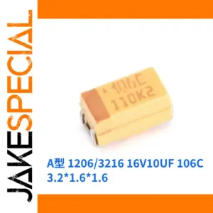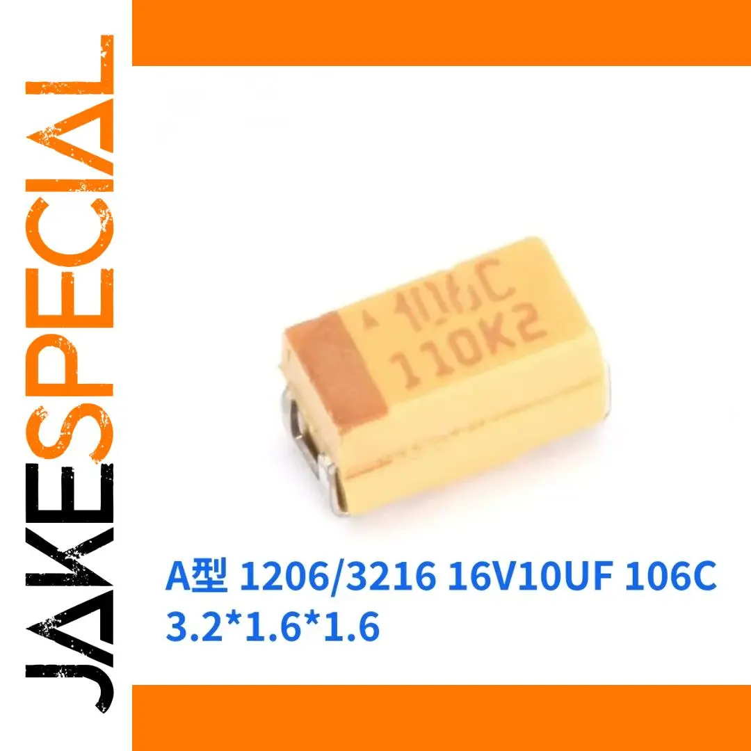 Experience reliable performance with this set of 10 surface mount tantalum capacitors in the 1206/3216 package size, featuring a 16V voltage rating and 10μF capacitance marked as 106C. With a capacitance tolerance of ±10%, these high-quality components are ideal for precise electronic circuit applications. Their sleek, yellow, glossy surface exhibits a modern and professional appearance, with compact, rectangular design and metallic silver leads for surface mounting. Designed for durability and efficiency, these capacitors are perfect for enhancing your electronic projects, ensuring stable power management and performance in demanding environments.