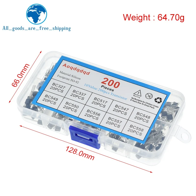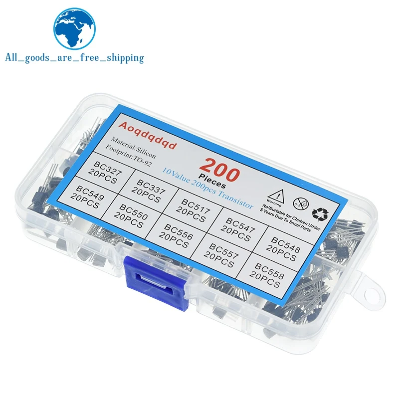 Discover the convenience and organization of this premium set of surface-mount transistors. Ideal for electronics enthusiasts and professionals, this product offers a carefully curated collection of 200 high-quality silicon transistors, divided into 10 distinct values with 20 pieces each. Encased in a transparent plastic box with a vibrant blue latch, the components are visible and easily accessible. The labels are clear and professional, making identification straightforward. With models including BC327, BC337, BC517, BC547, BC548, BC549, BC550, BC556, BC557, and BC558, this collection is versatile, perfect for repairing or designing circuits in applications like televisions and other electronic devices. The sleek design ensures easy storage and quick access to exactly the component you need to complete your project efficiently.
