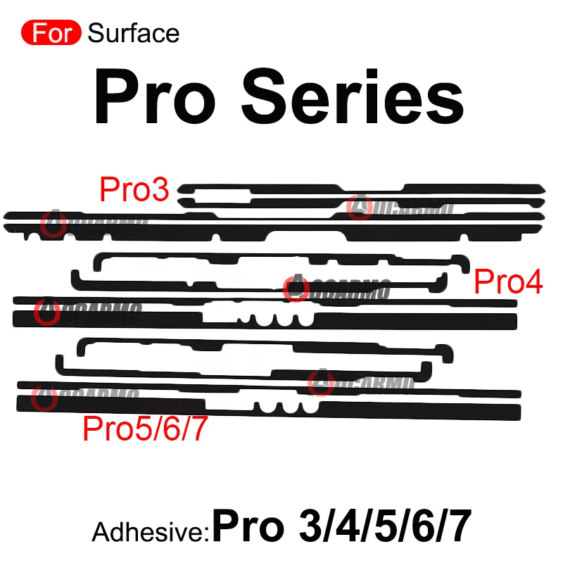 This set of black adhesive stickers and glue tape is specifically designed for Microsoft Surface Pro models 3, 4, 5, 6, 7, 8, and 9, ensuring precise fit and secure attachment of LCD display screens and frames. Featuring various shapes—ranging from straight with subtle curves, to intricate wave-like or scalloped forms—these flexible, high-quality adhesives are crafted for seamless integration and optimal performance. They are free from high-concern chemicals, providing a safe installation experience. Perfect for DIY repairs, this kit offers reliable, durable adhesion tailored for each Surface Pro model, helping you restore your device’s display with confidence and peace of mind.