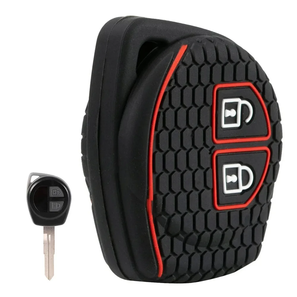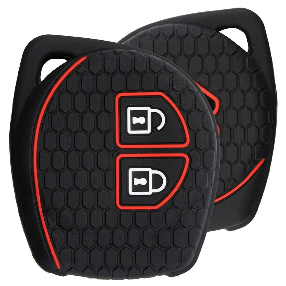 Enhance the protection and style of your Suzuki car key with this sleek black silicone remote cover. Made from eco-friendly, odorless silicone weighing only 10 grams, it features a durable honeycomb textured surface for a secure grip and a modern look. Designed with two precise cut-outs outlined in bold red borders, it securely fits various Suzuki models including Ignis, Wagon-R, Swift, Splash, SX4, S-Cross, Liana, Grand Vitara, Vitara, Baleno, Celerio, Jimny, and Alto. This lightweight, non-toxic case offers easy installation and cleaning with water, safeguarding your key from scratches, dust, and minor impacts while adding a sporty touch to your vehicle’s accessories.