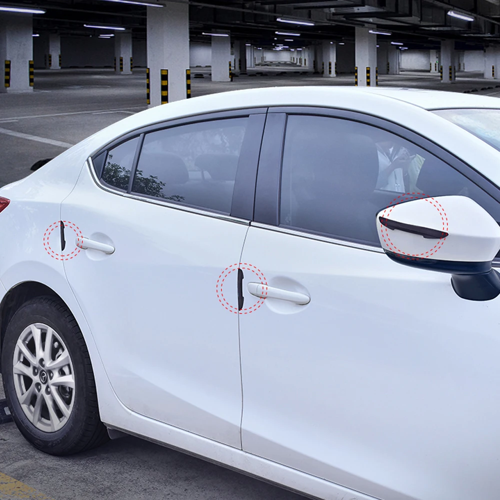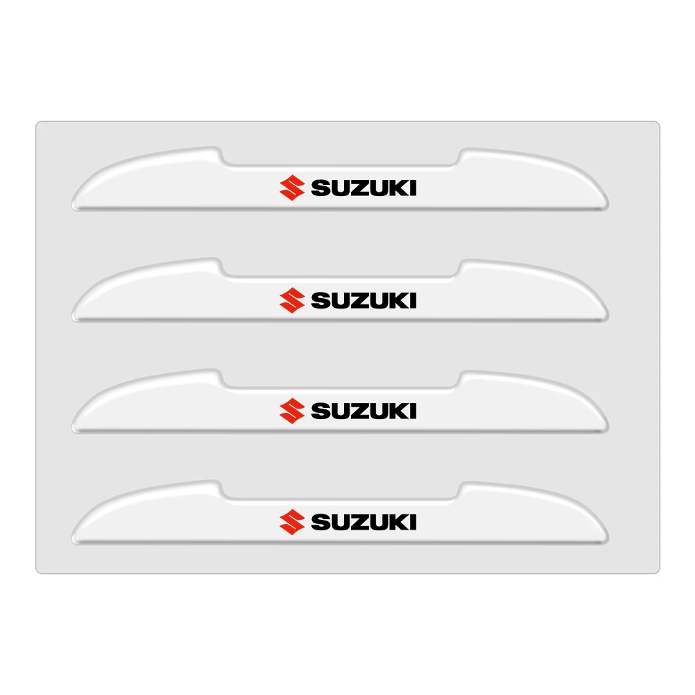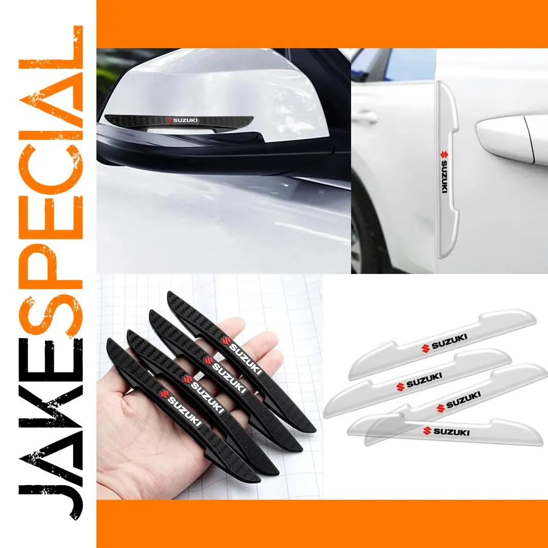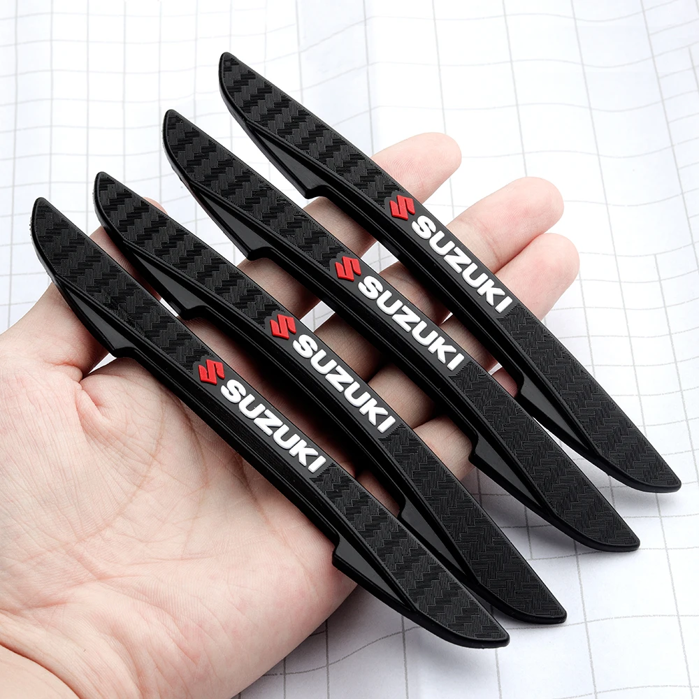 Enhance your Suzuki with this set of four sleek, black carbon fiber-style anti-collision door edge stickers, measuring as shown in the image and designed to fit models including Swift, SX4, Samurai, Baleno, Vitara, Jimny, Sierra, Ignis, Alto, and more. Made from durable rubber with double-sided tape, these heat and sunlight resistant strips are easy to apply and help prevent scratches from minor impacts on all four doors or rearview mirrors. Customization options with OEM logos are available for bulk orders of 100 or more, ensuring a personalized and stylish protection solution for your vehicle that combines practicality with modern aesthetics.