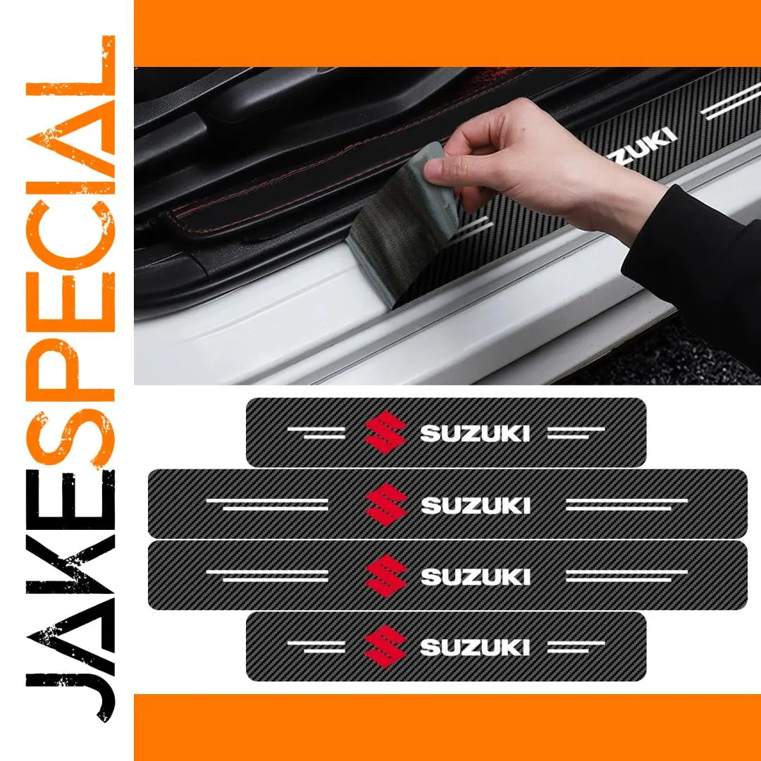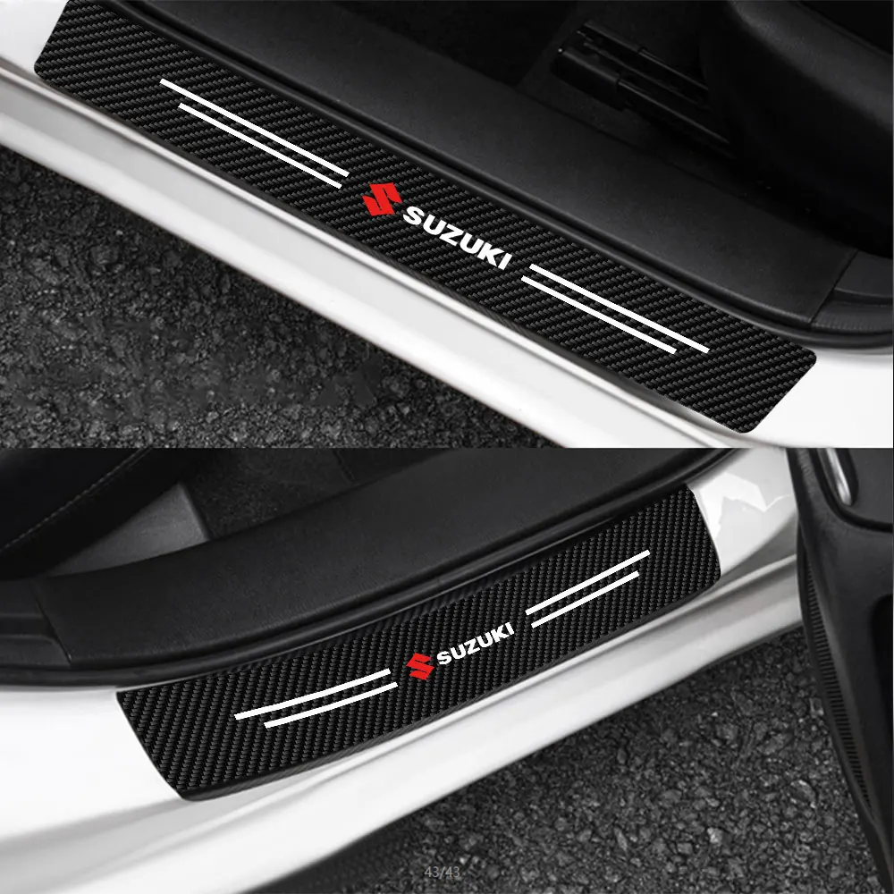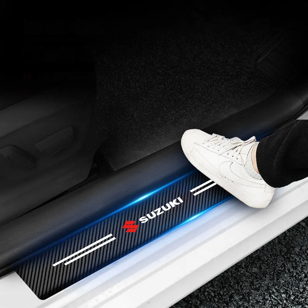 Enhance your Suzuki vehicle with this set of four sleek black carbon fiber leather door sill protectors, designed specifically for models such as Alto, Samurai, Grand Vitara, Baleno, SX4, Swift, Jimny, and Ignis. Crafted from durable carbon fiber leather material with a textured, high-tech appearance, these protectors feature a modern minimalist style with smooth, rounded edges and a subtle sheen. Easy to install—just clean, peel, and press—they provide excellent scratch resistance and an upgraded sporty look. Each piece is customizable in size to fit your door sills perfectly, helping you keep your vehicle looking stylish and well-maintained.