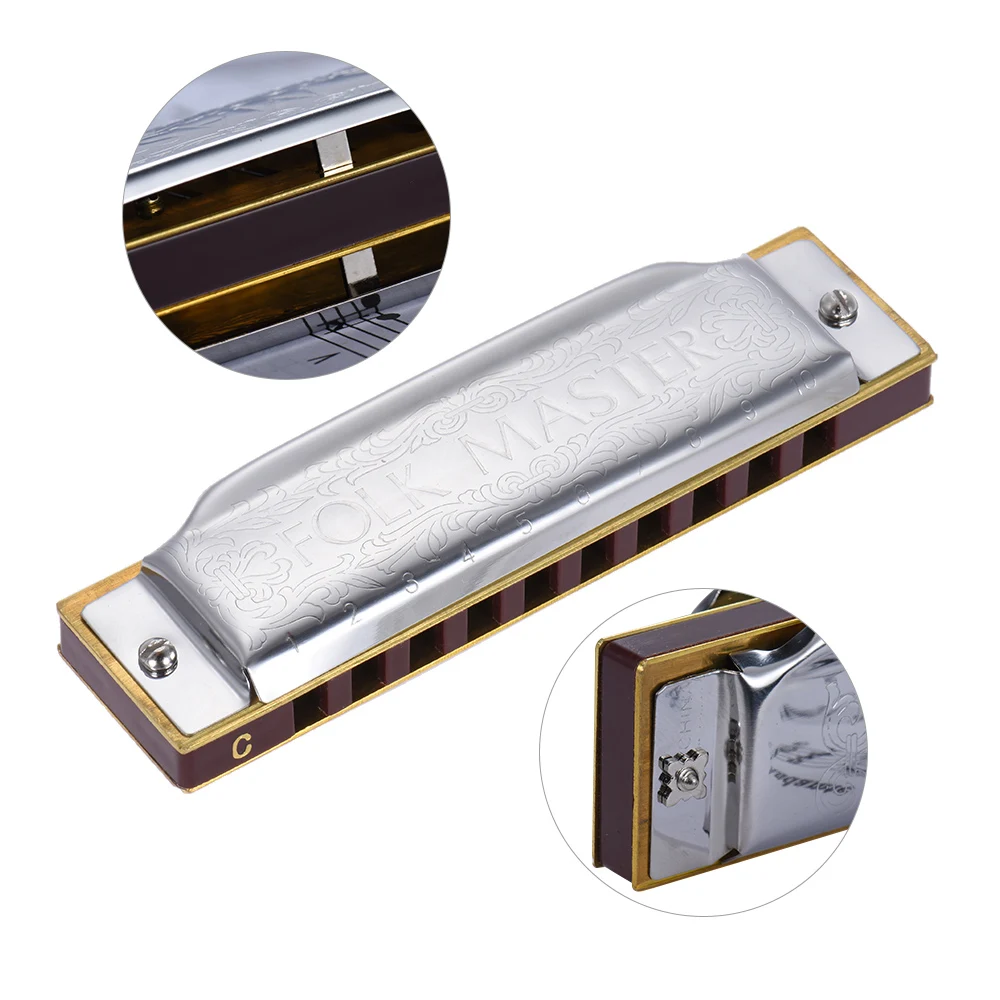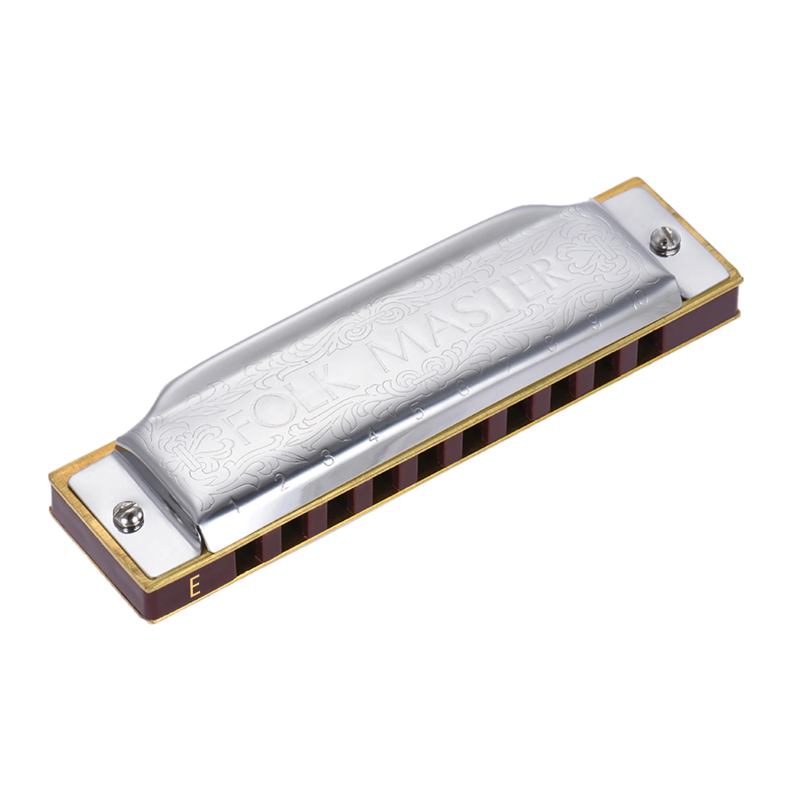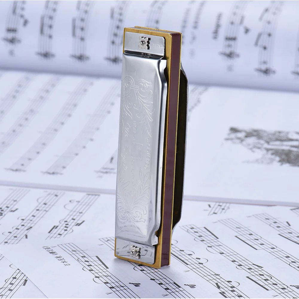 Experience rich, clear tones with this high-quality 10-hole diatonic harmonica in the key of C, measuring 10 x 2.7 x 2.0 cm and weighing just 53 grams. Crafted with resin frets and a durable stainless steel cover plate decorated with elegant patterns, it offers 20 tones for expressive play. The harmonica features high-quality alloy springs for smooth responsiveness and a sleek, reflective metallic appearance contrasted by dark accents, emphasizing its timeless craftsmanship. Suitable for both beginners and seasoned musicians, it includes a protective box and user manual, creating the perfect combination of functionality and aesthetic appeal for your musical journey.