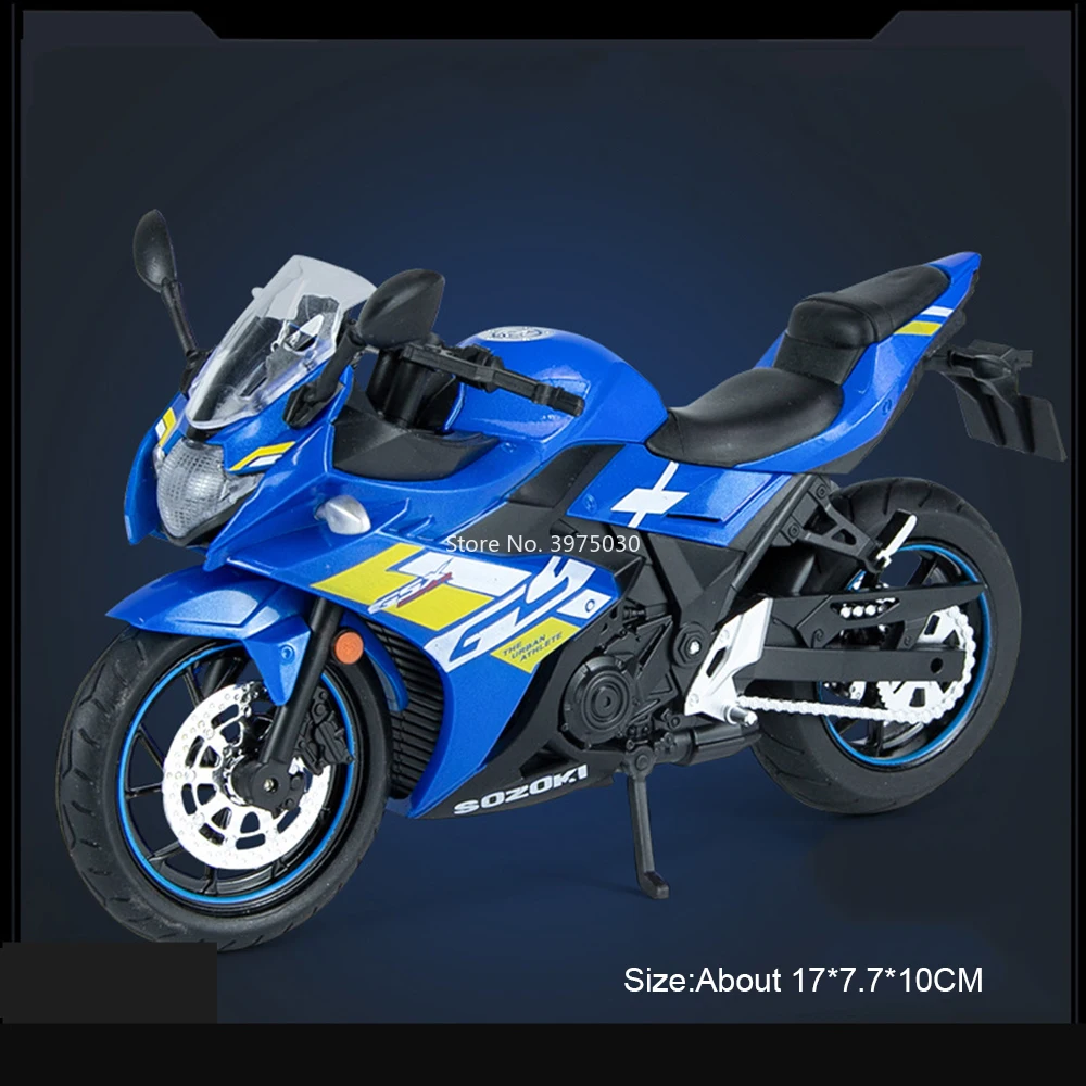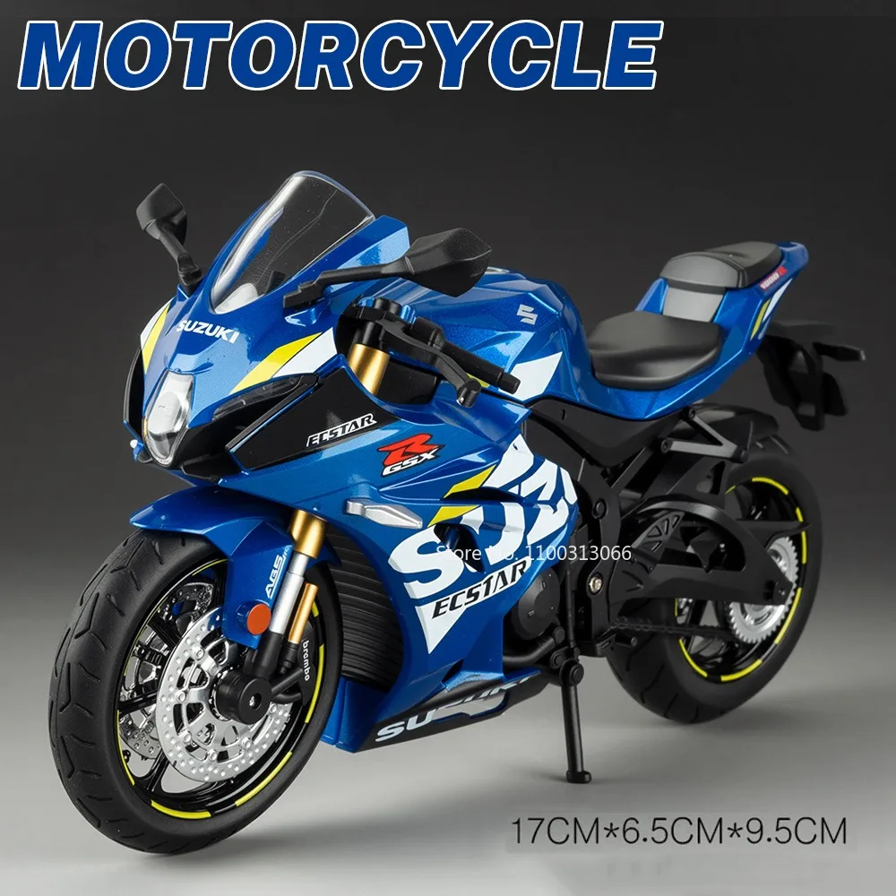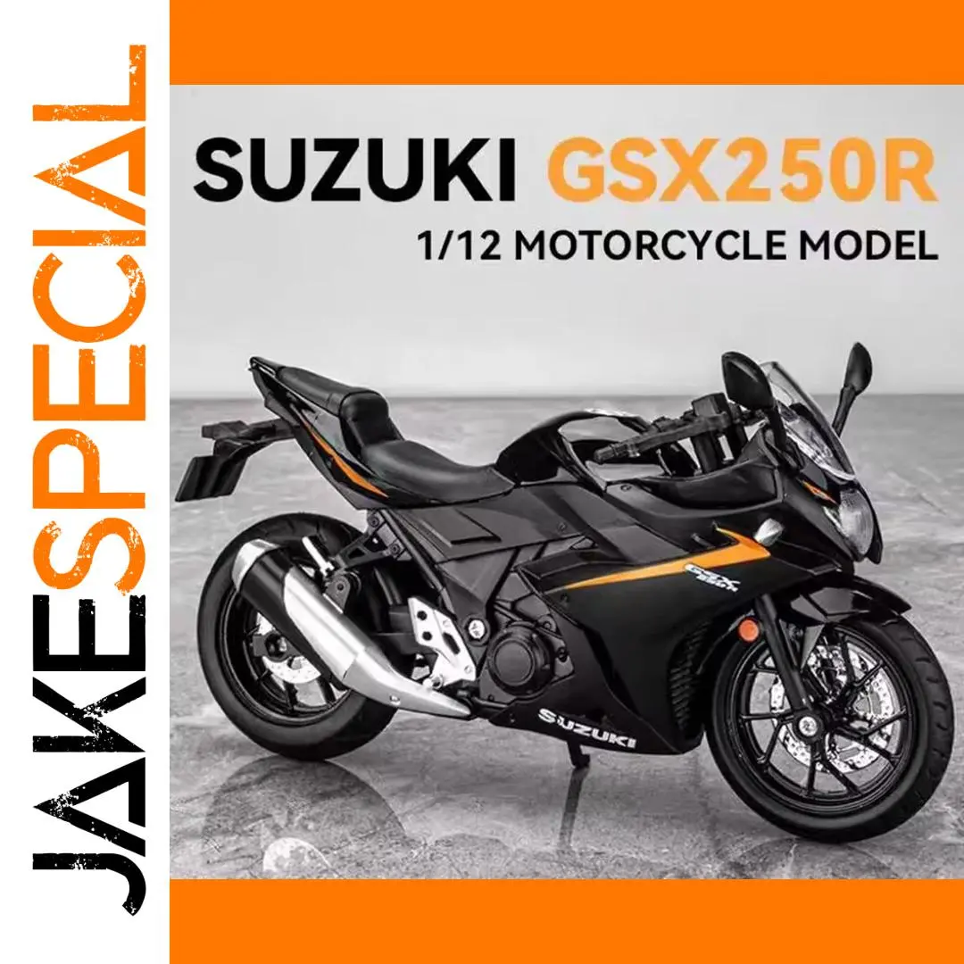 This 1:12 scale diecast motorcycle model features a detailed design resembling the Suzuki GSX250R or GSX1000R, available in striking blue, white, and black colors. Crafted with a zinc metal body, plastic chassis, and rubber tires with textured tread, it offers realistic aesthetics and durability. Functional features include front wheel steering, built-in lighting, rear wheel shock absorption, and interactive parts powered by included batteries. Measuring approximately 17 x 7.7 x 10 cm for the GSX250R and 17 x 6.5 x 9.5 cm for the GSX1000R, this high-simulation model is perfect for collectors aged 14 and above seeking a premium, realistic miniature motorcycle.