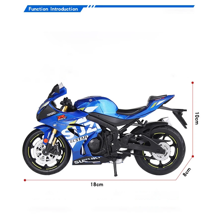 Elevate your collection with this stunning 1:12 scale diecast model of the iconic Suzuki GSX1000R motorcycle. This exquisite model features a striking glossy black body adorned with vibrant red highlights, showcasing the aerodynamic design synonymous with sport bikes. Every detail is meticulously crafted, from the realistic wheels to the detailed headlights, enhancing its allure. Designed for both display and admiration, this model features built-in sound and light functions to captivate any motorcycle enthusiast. Imagine showcasing this masterpiece in your collection, a true testament to speed and elegance.