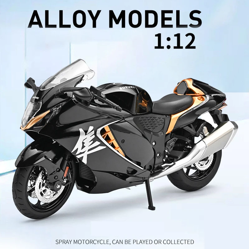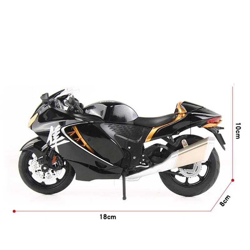 This highly detailed 1:12 scale diecast motorcycle model of the Suzuki Hayabusa features a sleek, aerodynamic design with a predominantly black finish accented by gold or bronze highlights along the fairings and near the seat. Crafted from alloy and plastic, it showcases intricate sculpted fairings, visible engine components, and realistic rims and tires, creating an authentic and dynamic appearance. The model includes sound and light functions for added realism. Suitable for collectors aged 14 and above, it comes in various color options—black or white—with or without presentation boxes. Shipped via air freight with tracking, it is a robust, visually striking display piece that captures the speed and style of the iconic Hayabusa.