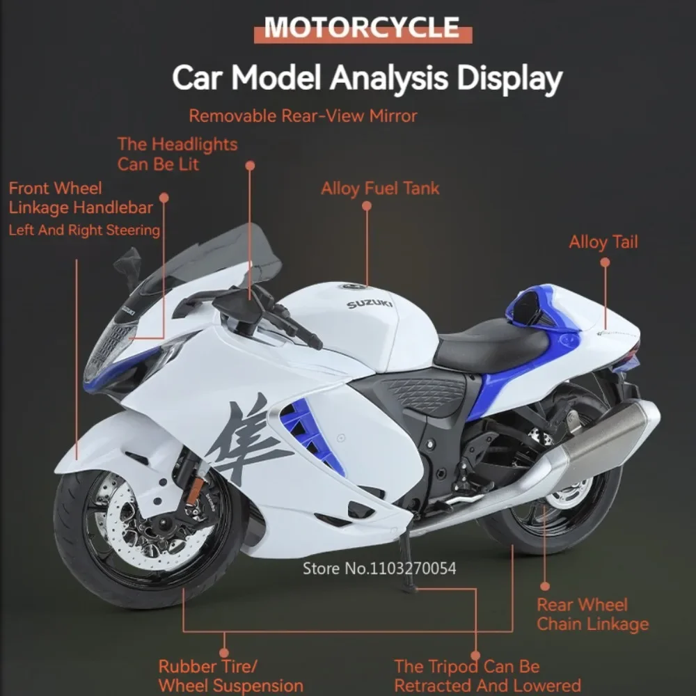 Dive into the world of high-quality motorcycle replicas with this stunning Suzuki Hayabusa model. Whether you're an enthusiast or looking for a unique gift, this detailed and realistic diecast model offers durability and excitement. Its compact size and intricate features make it a remarkable display piece, elevating any collection or space. Add this powerful and stylish model to your collection today and enjoy the craftsmanship that captures the spirit of the original motorcycle. Don't miss out on this exceptional piece designed to impress and inspire!