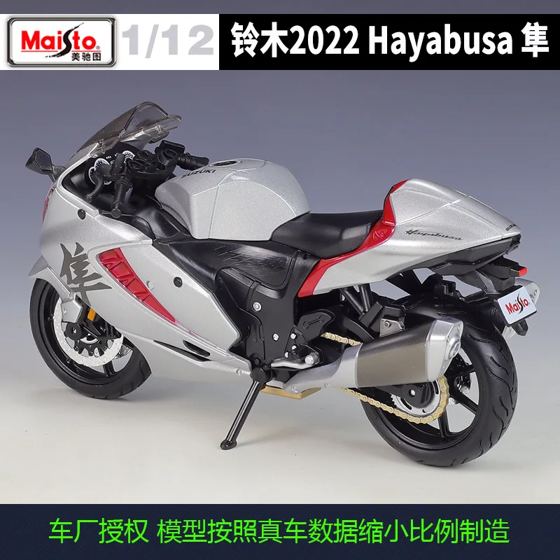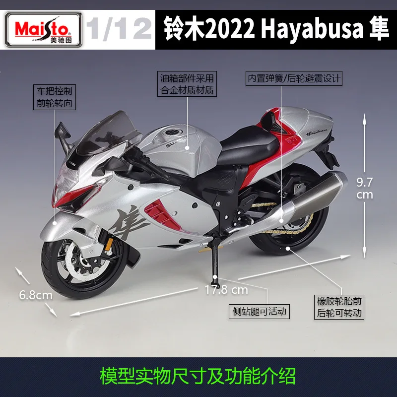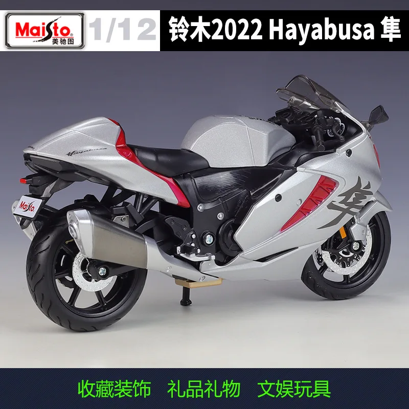 Experience the thrill of owning a precise replica of the iconic Suzuki Hayabusa 2022 motorcycle with this meticulously crafted 1:12 scale diecast model. Its sleek, aerodynamic design captures the essence of the original, featuring a silver metallic finish complemented by striking red accents on the fairing and rear panels. The model showcases sharp, angular lines that emphasize its sporty and aggressive stance, with a transparent windshield edged in black for a modern touch. The black, textured seat contours perfectly for a dynamic look, while the detailed black tires with textured treads add realism. Whether displayed on a shelf or used for collection, this model embodies high-performance aesthetics and intricate craftsmanship that appeals to motorcycle enthusiasts and collectors alike.