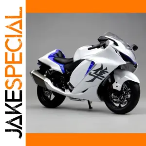 Experience the thrill of the Suzuki Hayabusa GSX-1300R with this highly detailed 1:18 scale diecast model, crafted from alloy and plastic, measuring 12.3 cm long, 5 cm wide, and 6.6 cm high. Its sleek, aerodynamic design is finished in glossy white with striking black accents on the frame, wheels, and handlebar areas. Features include a sharp headlight assembly, realistic tread-patterned wheels with disc brakes, a metallic exhaust pipe, and a blue rear fairing accent that mimics aerodynamic vents. Perfect for collectors and enthusiasts, this compact model offers a true-to-life appearance, making it an impressive display piece.