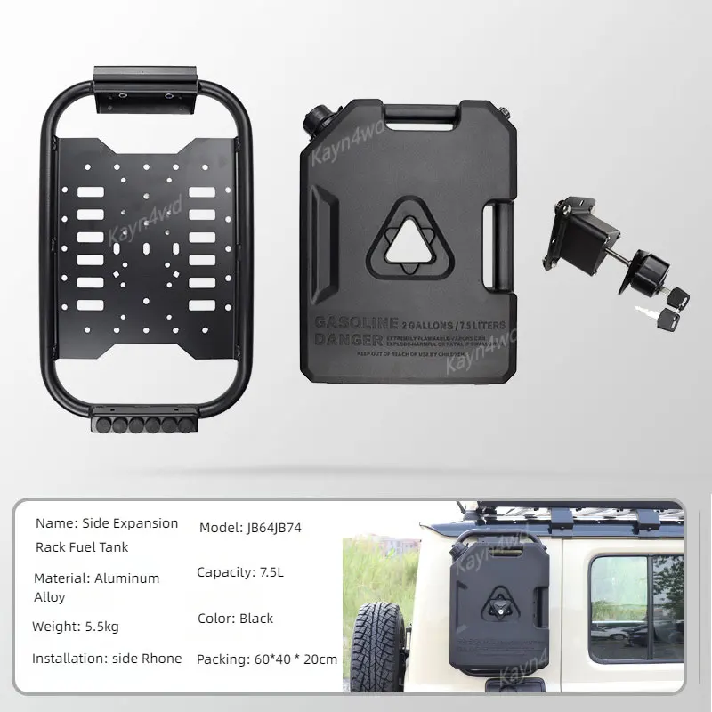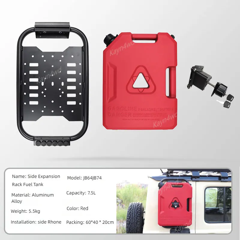 Experience enhanced outdoor adventures with this durable off-road accessory designed specifically for the Suzuki Jimny 5-door models from 2019 to 2024. Combining functionality and rugged style, this versatile unit features a sleek, rectangular black or red fuel tank with rounded edges, offering a capacity of 7.5 liters to extend your vehicle's range. Integrated into a sturdy aluminum alloy and polypropylene frame, it doubles as a rear window expansion rack, providing extra storage for all your gear. With a seamless, lightweight design, it mounts securely above the spare tire area, blending durability with streamlined aesthetics. Easy to install and free from high-concern chemicals, this accessory is perfect for off-road enthusiasts seeking reliability and utility.