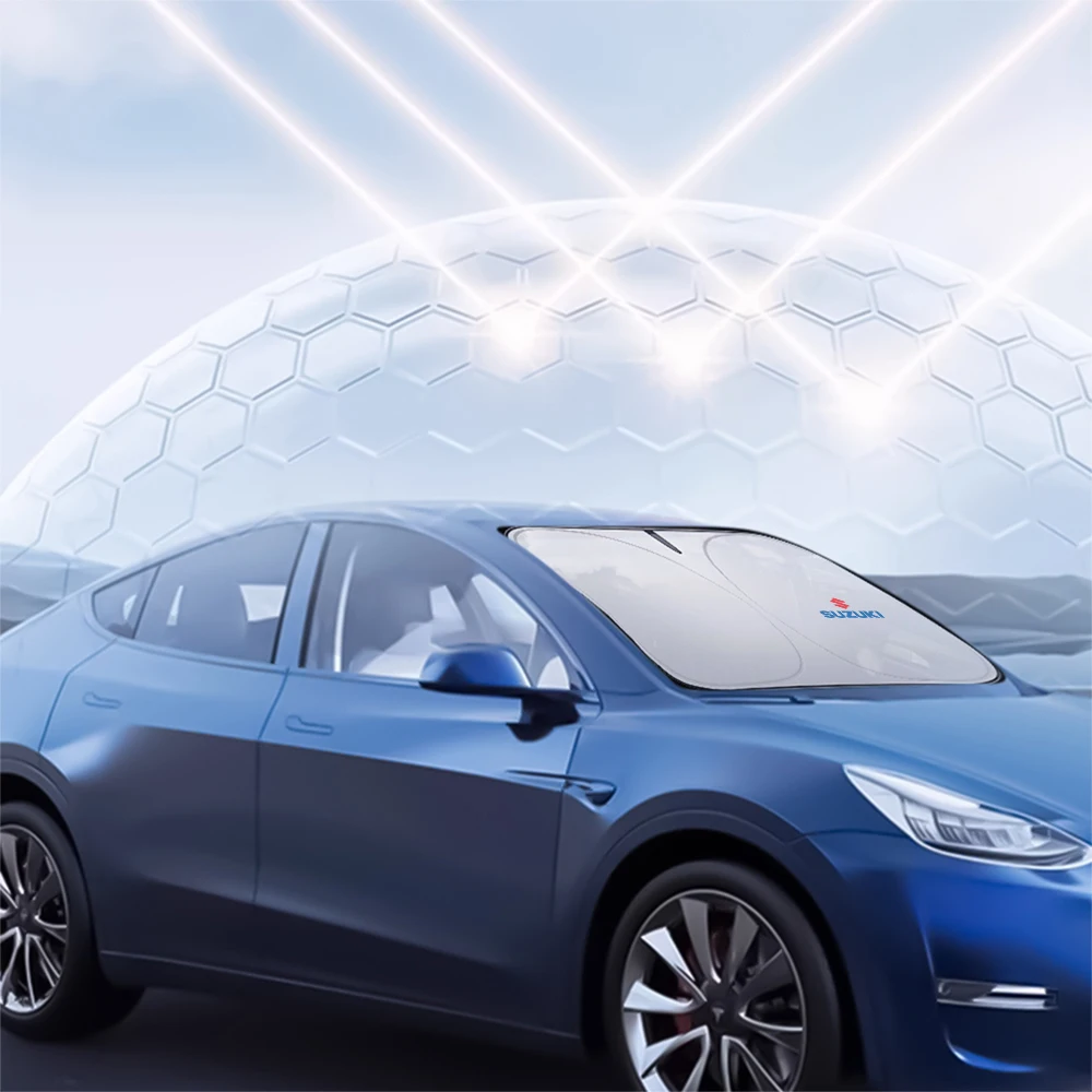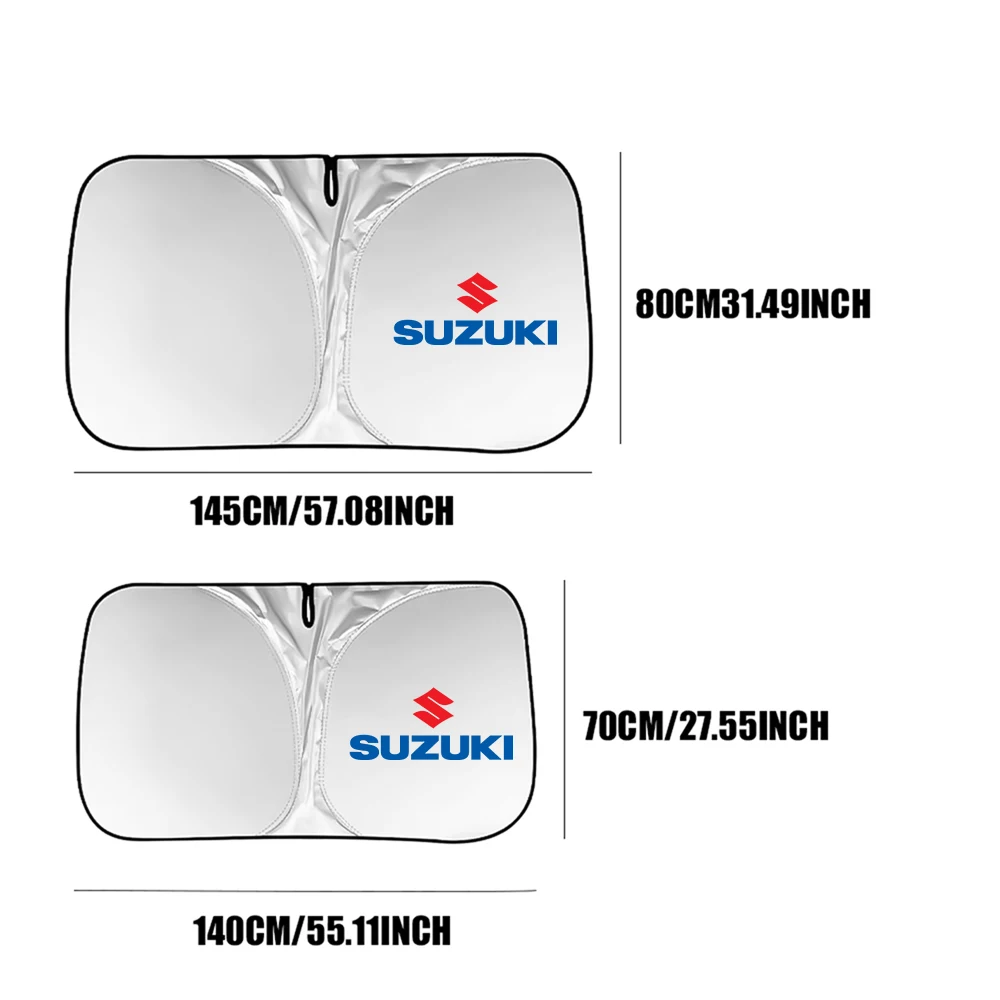 Experience superior sun protection with this sleek silver car sunshade, available in two sizes: 145 x 80 cm and 140 x 70 cm, tailored for Suzuki models such as Alto, Samurai, Grand Vitara, Baleno, SX4, Swift, Jimny, and Ignis. Made from durable composite peptide materials resistant to high temperatures, it ensures long-lasting performance and air freshness inside your vehicle. Its foldable design allows quick disassembly in one second, and it conveniently folds into a compact leather bag for effortless storage. Perfect for cars, trucks, SUVs, minivans, and vans, this sunshade offers full windshield coverage for maximum sun protection during hot weather, combining practicality with high-quality construction.