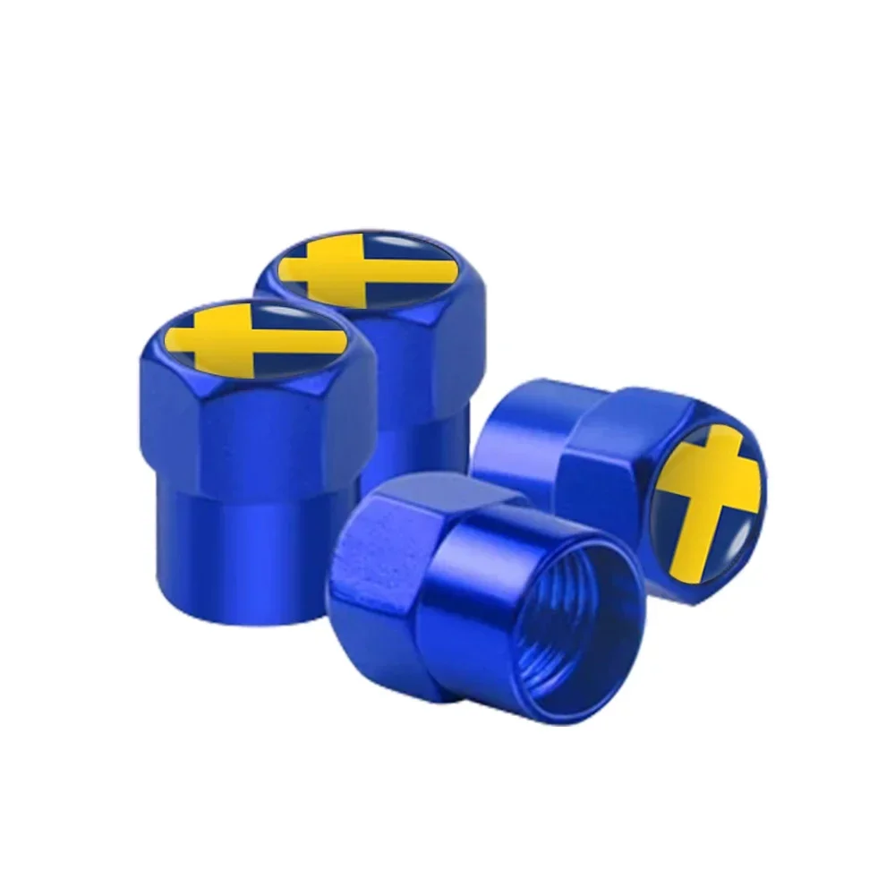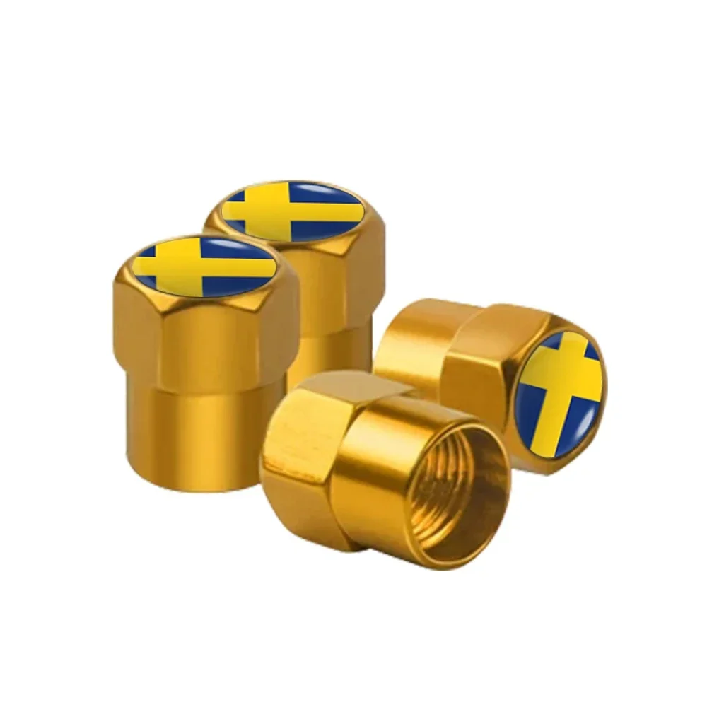 Enhance your vehicle’s appearance with this set of four metal valve caps featuring the iconic Sweden logo. Crafted from durable aluminum alloy, these caps offer a sleek metallic finish and come in a variety of vibrant colors including silver, blue, black, red, green, and gold. Their hexagonal shape with a slightly raised, rounded top ensures an easy screw-on fit for standard car tire valves. Each cap displays a circular blue background with a yellow cross, adding a touch of national pride to your car. Perfect for automotive enthusiasts, these caps deliver both style and practicality, protecting your valve stems while adding a distinctive look to your vehicle's wheels. Installation is straightforward, making your car stand out effortlessly.
