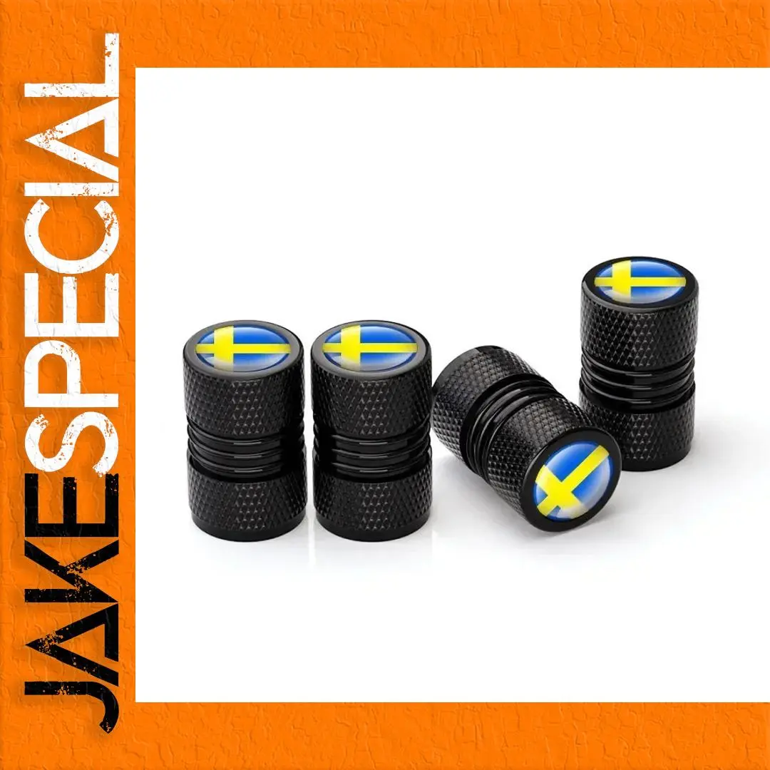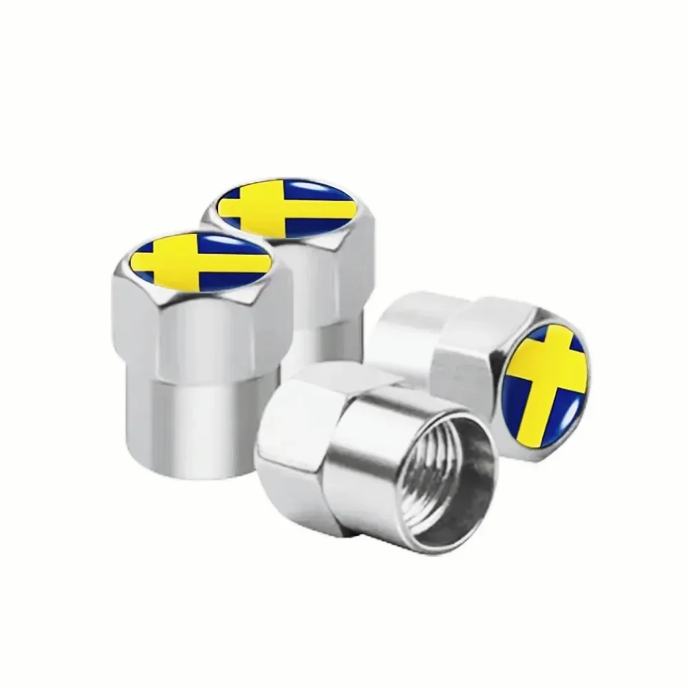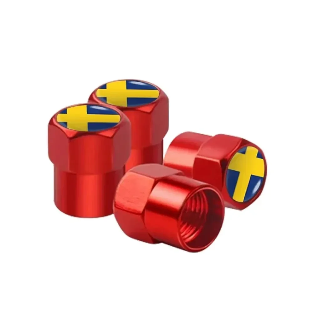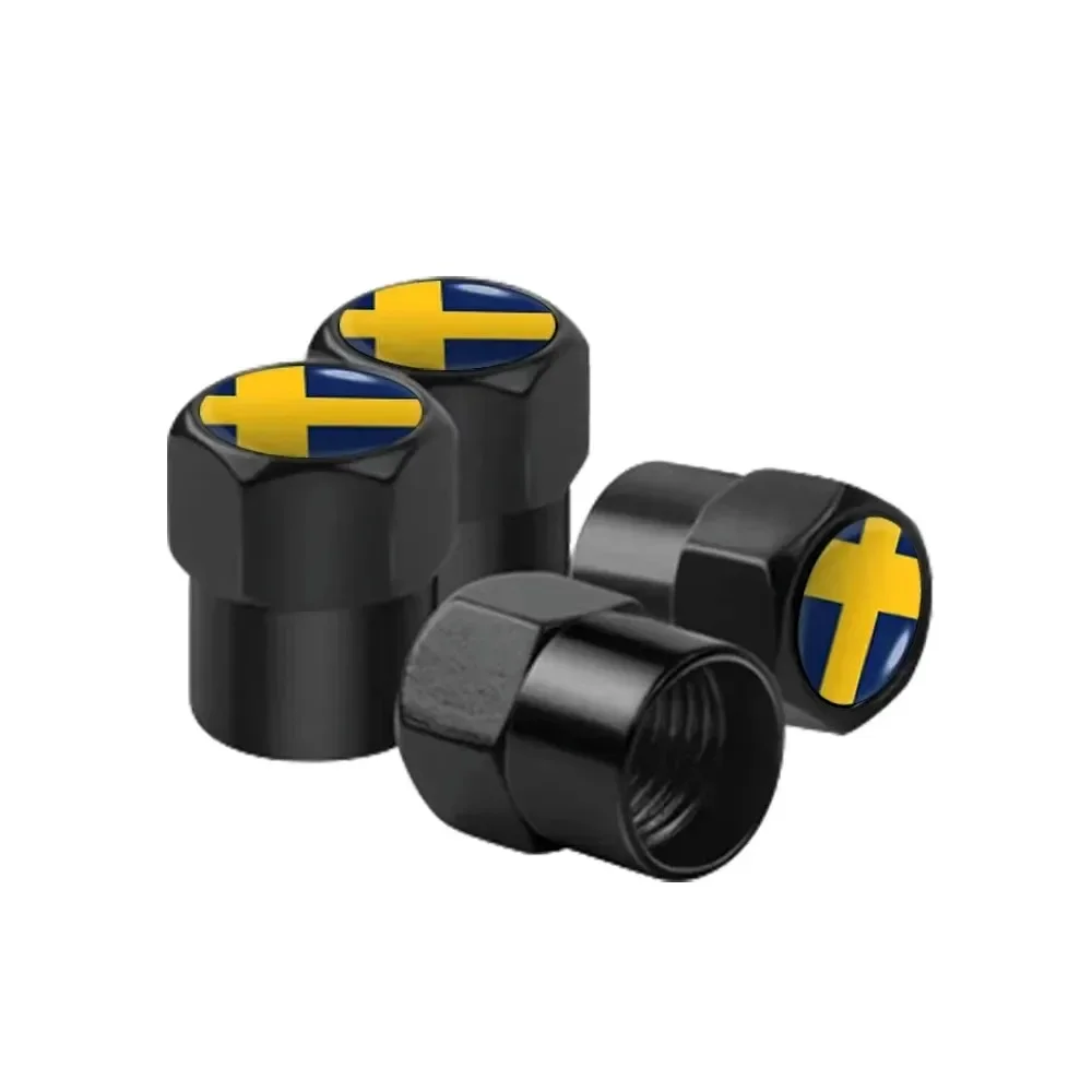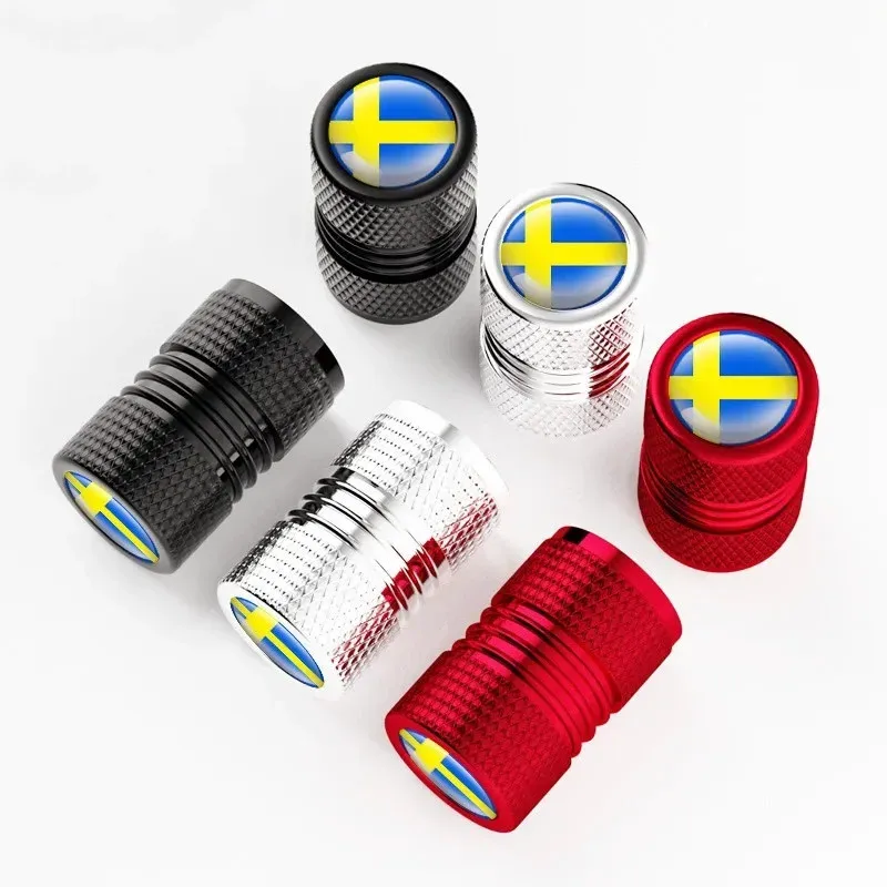 Step up your vehicle's look with this stylish set of four aluminum alloy valve caps featuring the iconic Swedish flag. Crafted from durable, corrosion-resistant aluminum, these caps combine practicality and patriotism. Their sleek metallic finish adds a sporty, modern touch to your car’s wheels. The domed top surface displays a sharp, glossy printed Swedish flag with a vibrant yellow cross on a rich blue background, easily catching the eye. The textured, knurled diamond-pattern grip area ensures easy handling during installation and removal, even in adverse weather conditions. Available in black, red, or silver, they allow you to match or contrast with your vehicle’s color, creating a customized and confident aesthetic. Imagine your ride standing out with this distinct patriotic accessory every time you hit the road.