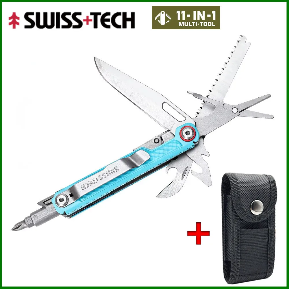 - This multi-tool features a compact, lightweight design made for portability during outdoor, camping, and survival activities, with a durable blue handle embossed with the Swiss Tech brand for a touch of style.