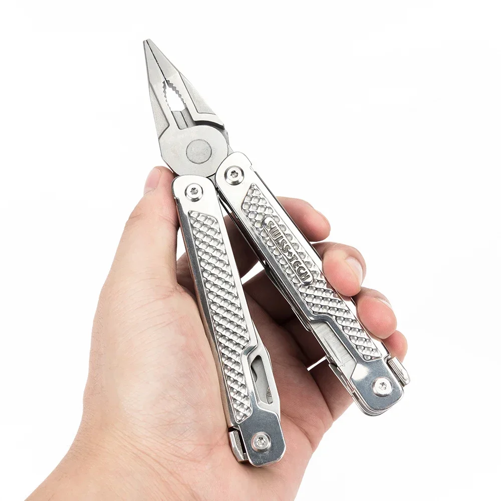 Imagine always being prepared for any situation with this sleek Swiss Tech 15-in-1 multifunctional folding pliers. Crafted from durable stainless steel with a polished finish, this versatile tool blends high craftsmanship with practical design. Its compact, foldable form makes it easy to carry in your pocket or bag, ready whenever you need it. The tools include a sharp knife made from 8Cr13MoV stainless steel, sturdy pliers, screwdrivers, a can opener, wire strippers, scissors, a saw, and wrenches—each with diamond-coated accents for added wear resistance. The anti-slip textured handles provide a secure grip, and the back lock mechanism ensures safety during use. Perfect for outdoor adventures, DIY projects, or emergency situations, this multi-tool is your reliable companion at all times.