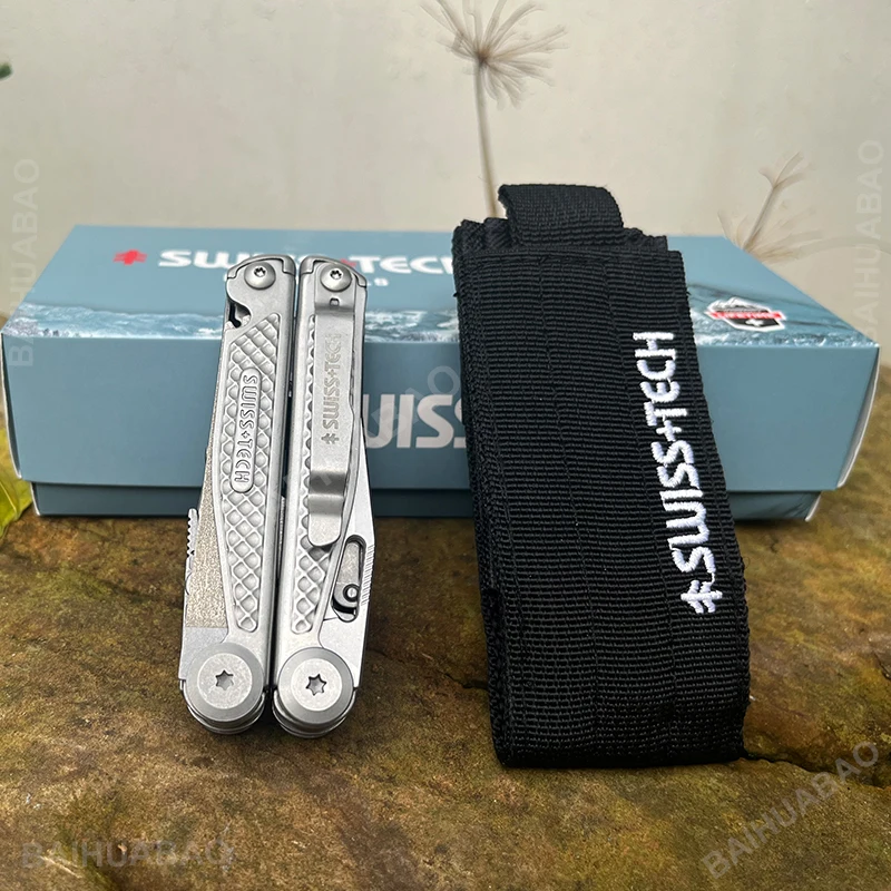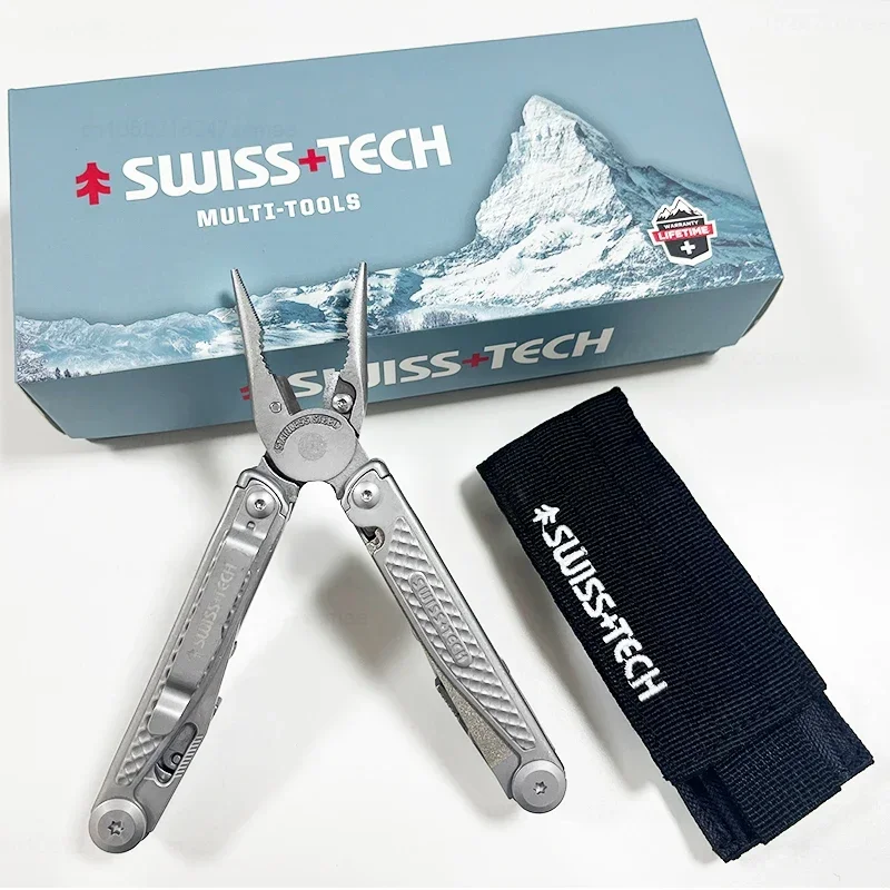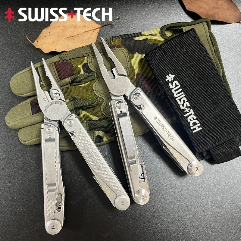 Experience ultimate versatility with this Swiss Tech 18-in-1 multitool, crafted from durable metal and featuring a sleek stainless steel finish. It includes multifunctional pliers such as nipper, standard, wire crimper, tangent, and hard wire cutters, along with scissors, a metal file, and a serrated saw blade. Additional tools encompass a Phillips screwdriver, flat screwdriver, main knife, bucksaw, wire stripper, bottle opener, and can opener, all secured with a safety lock. Designed for outdoor adventures, survival situations, and woodworking projects, this compact folding tool offers reliable performance and a textured handle for secure grip. Available in multiple versions and colors, it’s your go-to multi-tool for every challenge.
