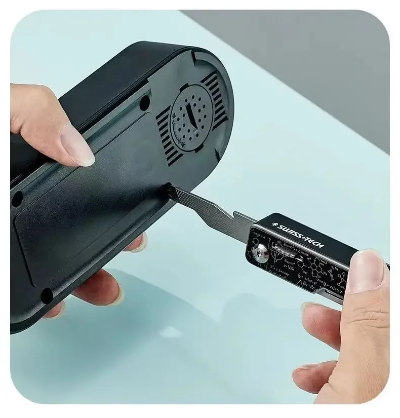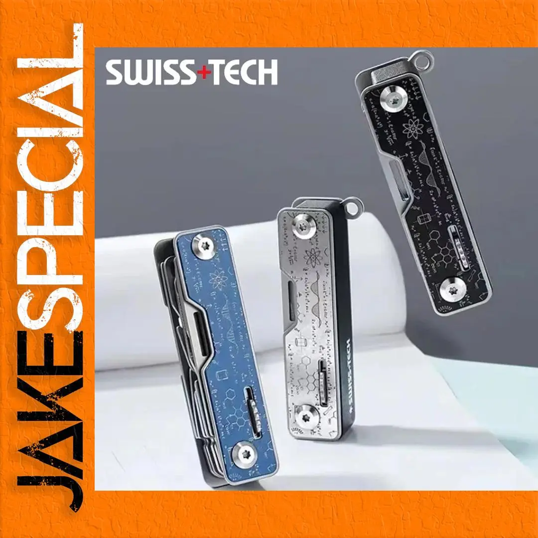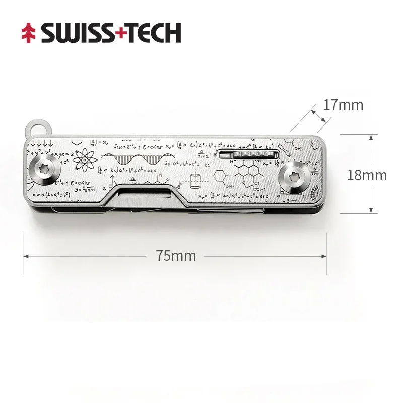 Experience the perfect blend of functionality and modern design with this Swiss Tech 9-in-1 multitool knife. Crafted with precision, it features a compact, rectangular form measuring 75mm x 17mm x 18mm and weighing only 81g, making it ideal for everyday carry. The tool offers a versatile set of functions including a 45mm main blade made from durable 3CR13MOV steel with an HRC45-55 hardness. Its stylish finish comes in three options: vibrant blue anodized with scientific patterns, matte silver engraved with scientific symbols, or bold black with metallic accents and chemical diagrams. Whether you're outdoors, working on household projects, or engaging in hobbies, this multitool is designed to be a reliable, space-saving companion that fits comfortably in your pocket or bag.