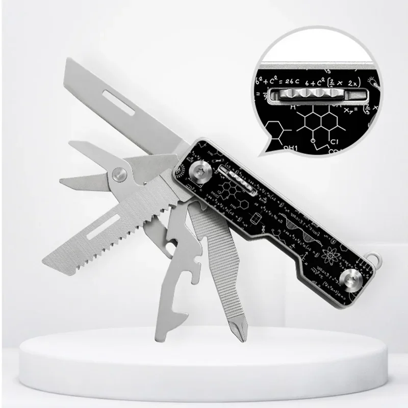 - The multitool is available in three colors—vibrant blue with scientific geometric patterns, matte silver engraved with scientific motifs, and daring black with chemical formula engravings—enhancing its aesthetic appeal.