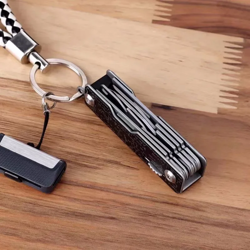 - It features multiple functions: scissors, nail file, Phillips and slotted screwdrivers, can opener, saw blade, bottle opener, and key ring, covering all your essential tools in one device.