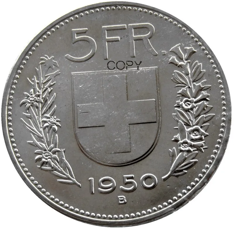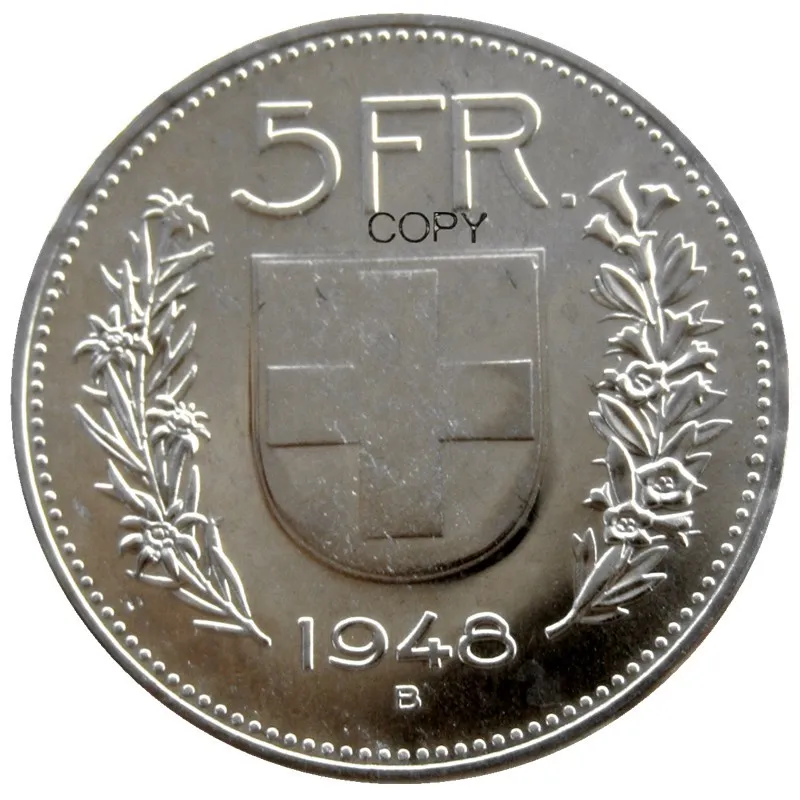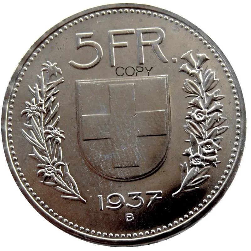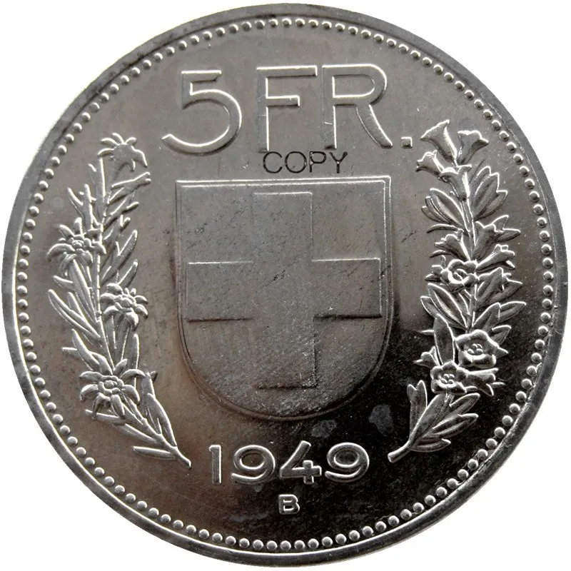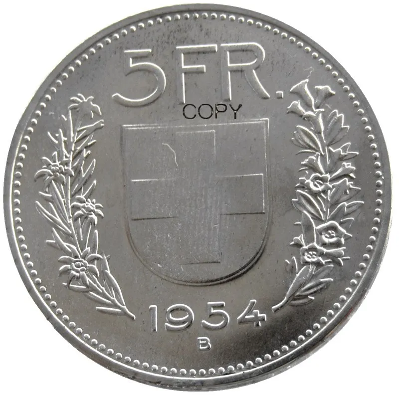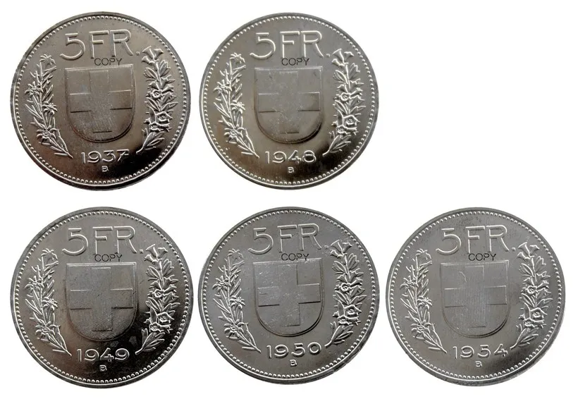 Discover a captivating set of five vintage Swiss 5 Franc coins from 1937, 1948, 1949, 1950, and 1954. Each coin features a striking metallic nickel finish that reflects a shiny, silver-like appearance, emphasizing its retro aesthetic. The central design showcases a prominent shield with a bold cross, symbolizing Swiss patriotism and national pride. Around the shield, elegant laurel or olive branches curve along the edge, adding intricate decorative details. The inscriptions include the denomination “5 FR” at the top, with the inscription “COPY” indicating these are reproductions. Raised elements such as the shield, year, and border are textured and polished, creating a sense of depth and craftsmanship. These coins evoke the timeless style of early to mid-20th-century European coinage, perfect for collectors seeking history, artistry, and patriotic symbolism.