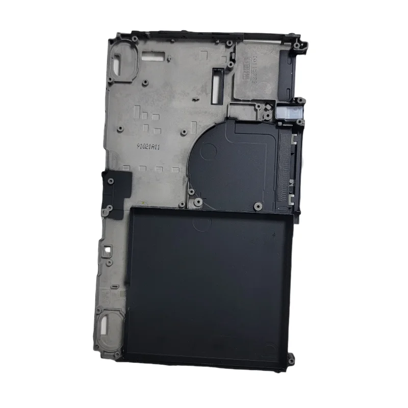 - Constructed from sturdy materials such as aluminum or steel, the midframe features a textured metallic surface for an industrial aesthetic, combined with a black plastic segment to assist with alignment and assembly.
