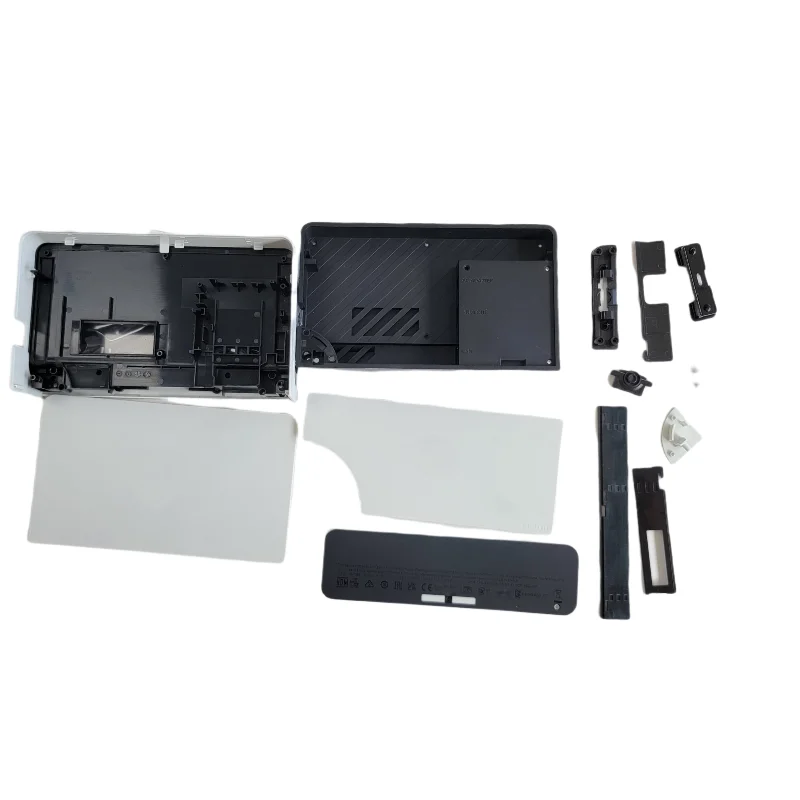 Transform your Nintendo Switch OLED with this carefully designed replacement shell cover set. Crafted from durable, high-quality black plastic with a matte finish, these components give your console a sophisticated, modern aesthetic. The set includes large rectangular panels featuring precise cutouts and slots for effortless assembly—perfectly aligning with your device’s internal structure. A distinctive white semi-circular shell fragment with ridges and mounting points provides a subtle contrast while adding structural strength and visual appeal. The included small clips, pins, and connectors are engineered for resilience and ease of installation, making the replacement process smooth. Whether restoring or customizing your console, this shell set offers durability, style, and a seamless fit, ensuring your Switch OLED looks and functions like new.