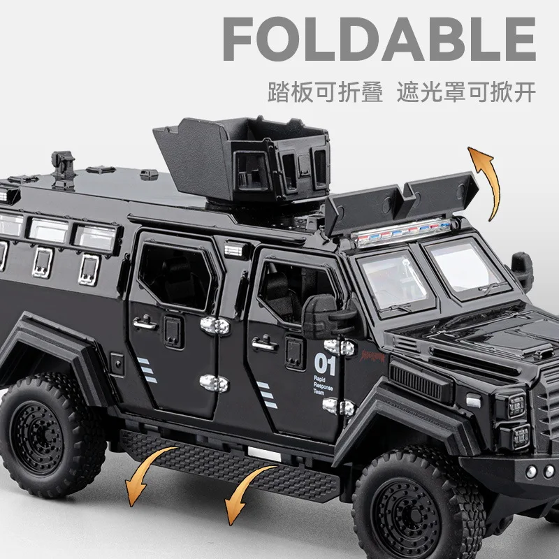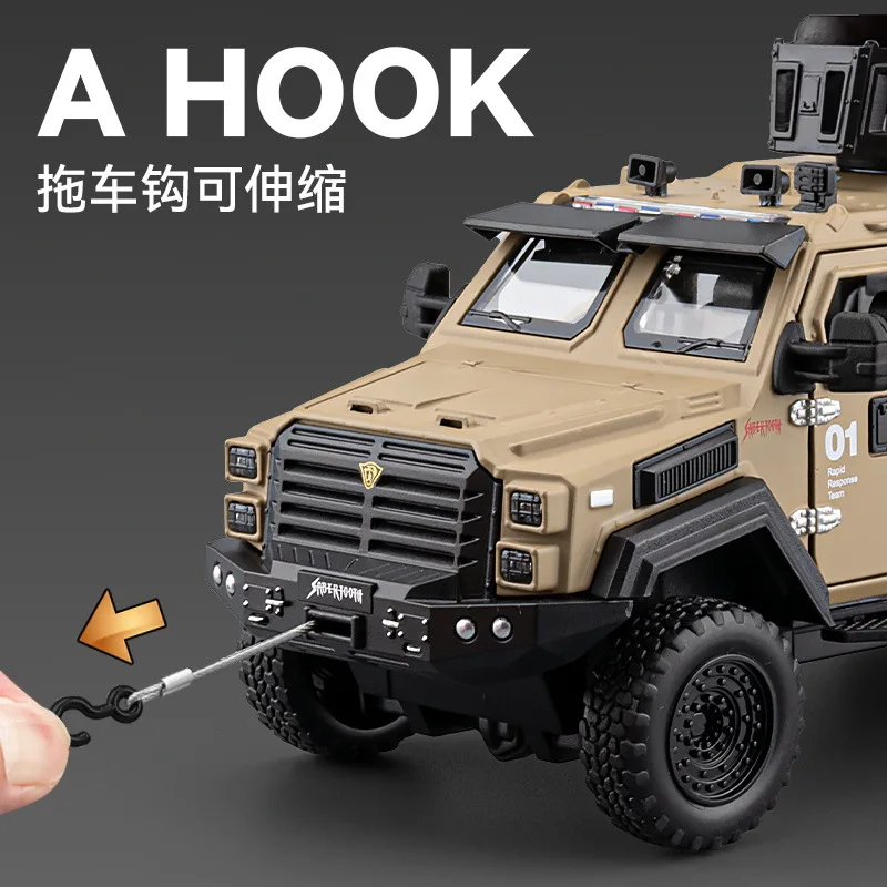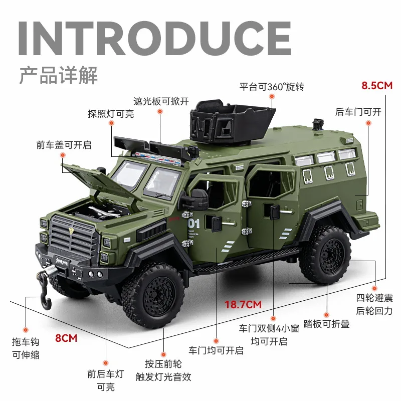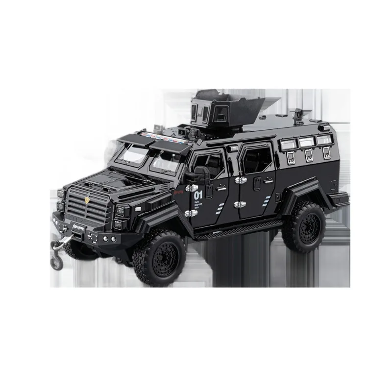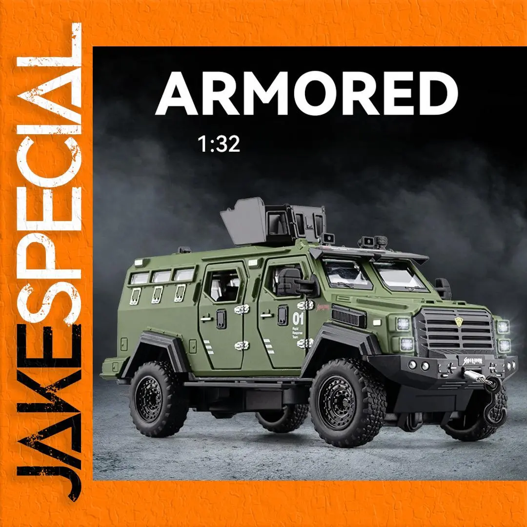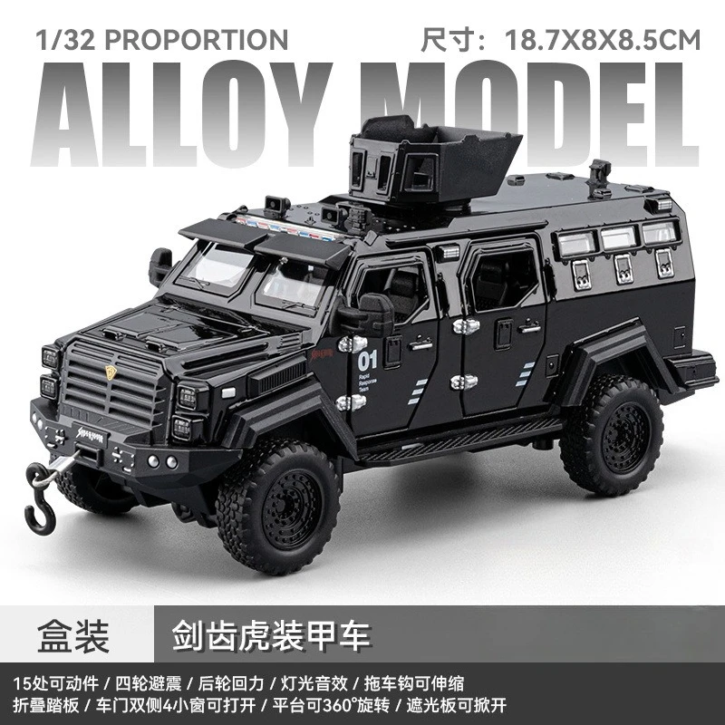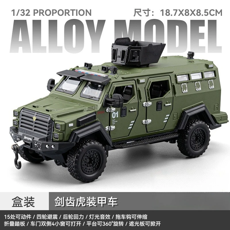 The 1:32 scale diecast model of the Sword Toothed Tiger police armored off-road vehicle showcases a matte olive green finish, highlighting its military-inspired design. This robust model features a detailed angular body, tinted windows, and multiple doors with realistic handles and locking mechanisms. An elevated roof unit suggests advanced surveillance capabilities, while the intricately designed front includes headlights and a prominent grille badge. Oversized wheels with deep treads enhance its rugged look and off-road capability. Enjoy immersive features with included sound and light effects, powered by a button battery, offering a striking representation for collectors and enthusiasts alike.