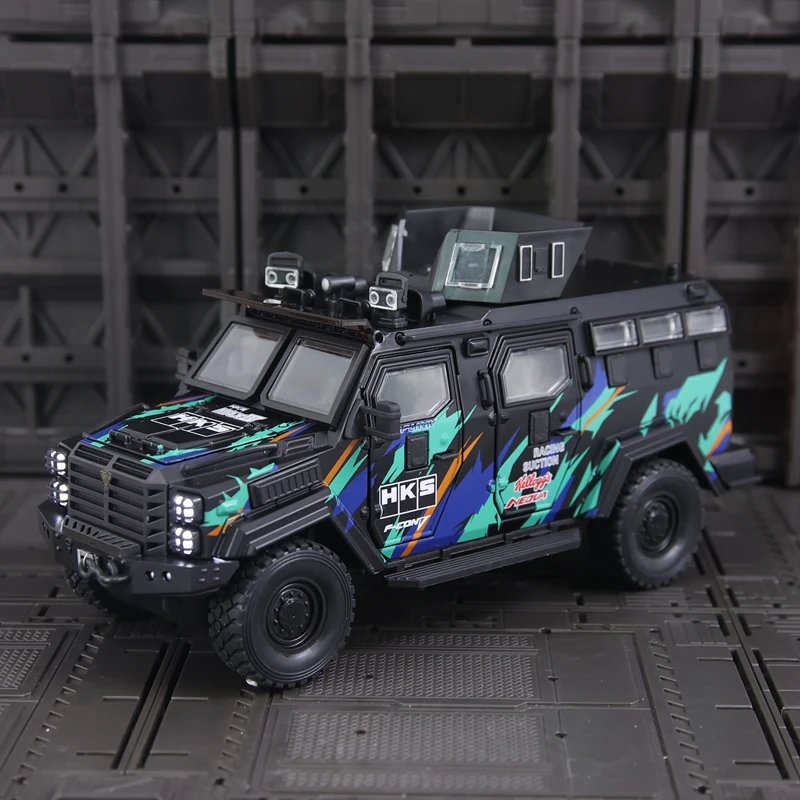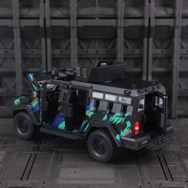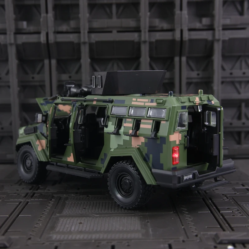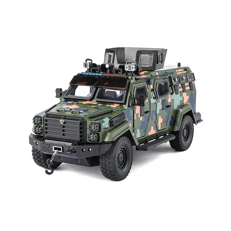 This 1:24 scale diecast armored off-road vehicle embodies strength and tactical prowess, ideal for collectors and enthusiasts alike. Its sturdy metal construction ensures durability, while the camouflage pattern in green, yellow, or black enhances its military appeal. The angular, aggressive design features a prominent black grille, vertical LED headlights, and a raised armored turret with transparent viewing windows, reflecting its explosion-proof capabilities. Designed for rugged adventures, this model boasts textured off-road tires and a host of sound and light functions to boost realism. Perfect for display or imaginative play, it captures the essence of tactical resilience and engineering excellence, making it a valuable addition to any collection of military-inspired models.