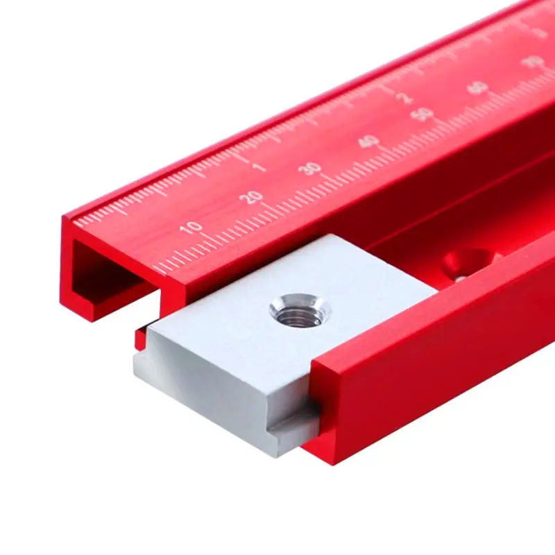 Discover the sleek and functional design of this this T-Track 45 Chute with Scale, crafted from durable aluminium alloy. Available in striking red and silver, it features a polished, smooth surface that combines industrial elegance with practicality. The rectangular tracks, approximately 45mm wide, are designed for easy mounting on router tables, saws, and workbenches. With lengths of 300mm, 400mm, and 500mm, these tracks incorporate precise white measurement scales with clear markings to ensure accurate adjustments. The tracks' robust construction and corrosion resistance make them ideal for long-term use in demanding woodworking environments. Their distinctive aesthetic provides both performance and visual appeal, facilitating high-precision jig and fixture work, along with quick, secure clamping of featherboards and fixtures.