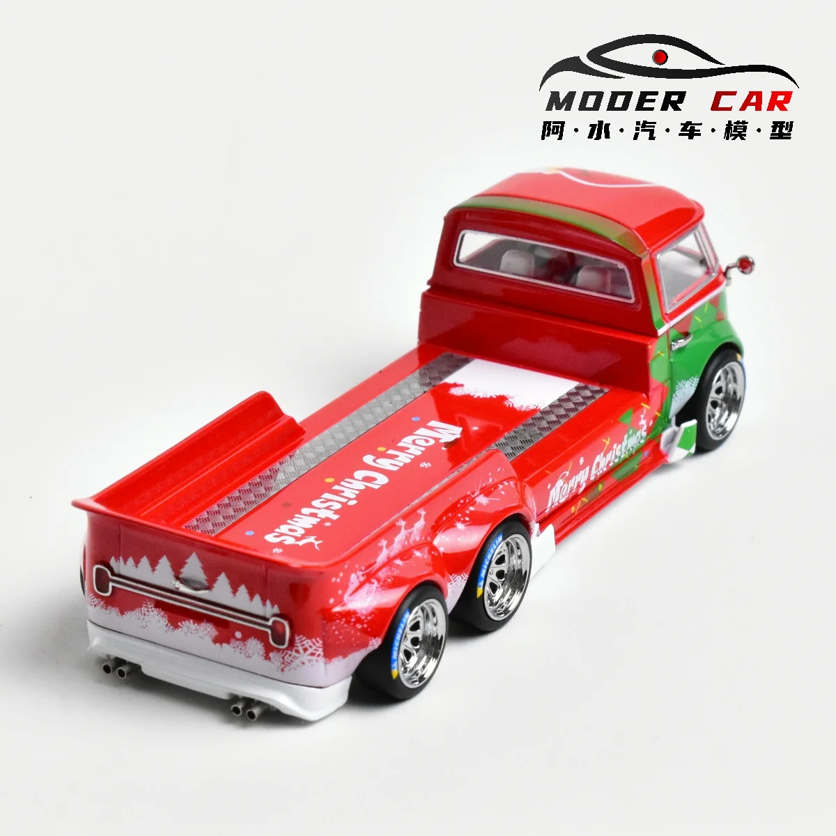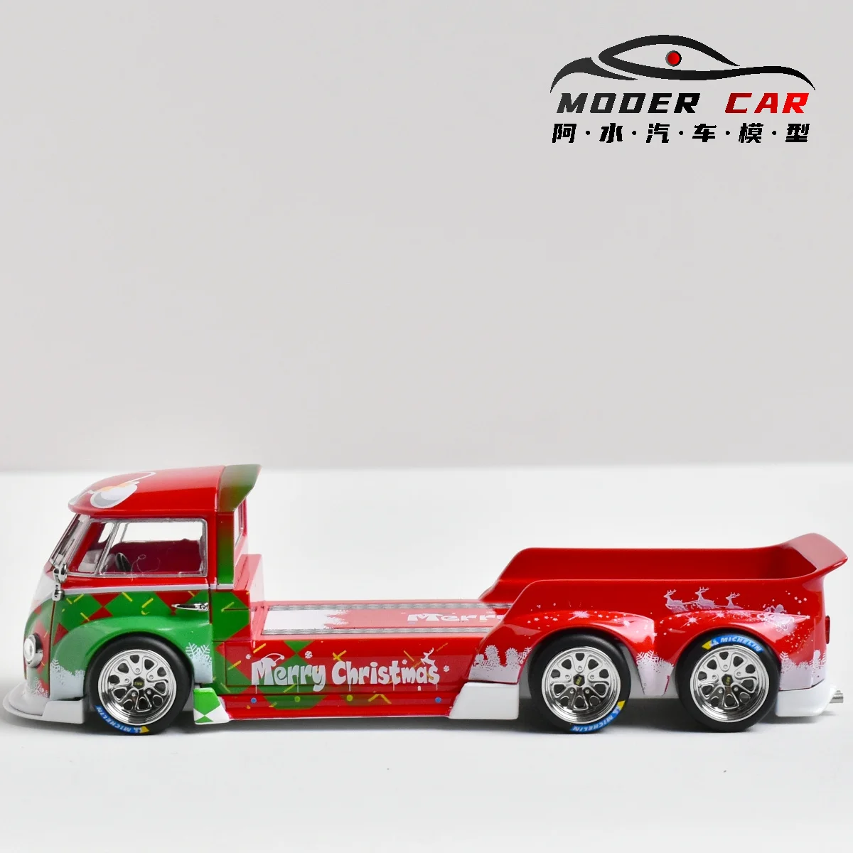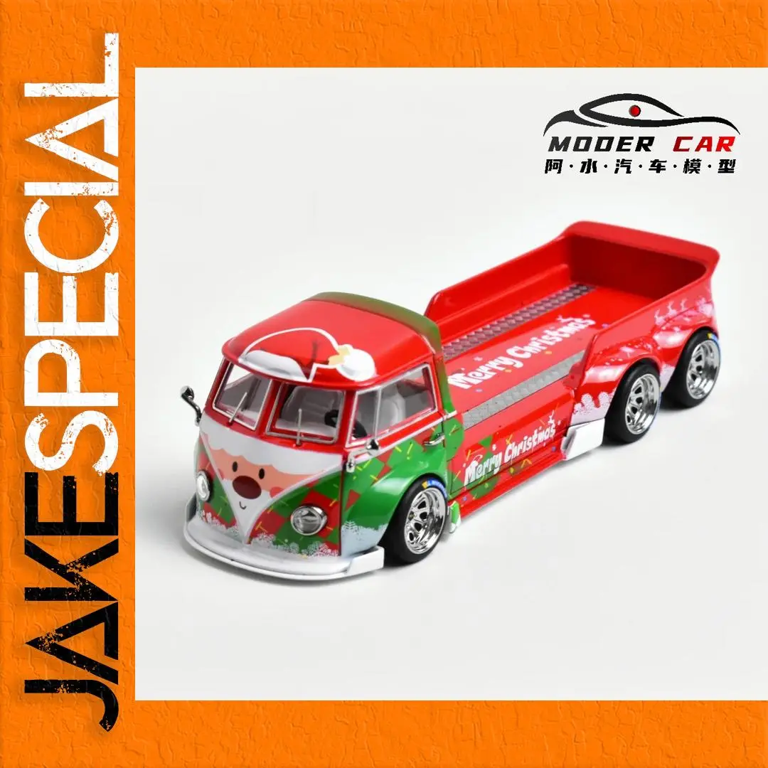 Experience the charm of the festive season with the T1 Tow trailer diecast model car, crafted by TSM MODEL. This 1:64 scale masterpiece features a vibrant bright red body with playful green accents and an expressive face, complete with a decorative Santa hat. The beautifully painted surface showcases delightful patterns reminiscent of Christmas decorations, including snowflakes and festive triangles. The shiny, detailed wheels provide an authentic touch, while the bright red flatbed trailer proudly displays the words “Merry Christmas.” Made entirely of metal, this whimsical model is an ideal collectible or gift for enthusiasts looking to celebrate the holiday spirit.