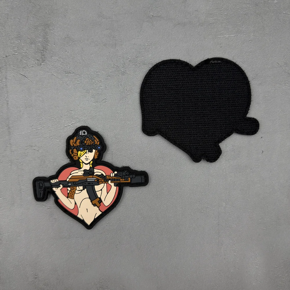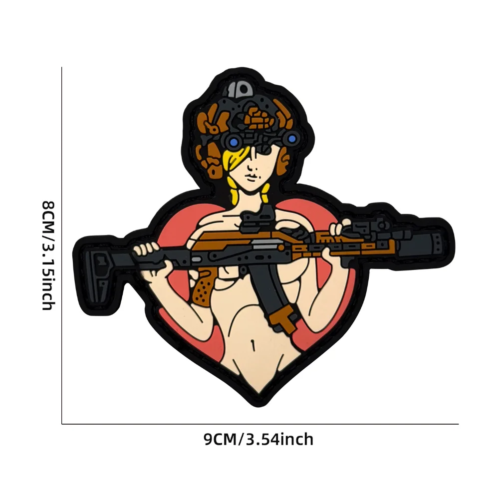 Step into a world of adventure and personalize your gear with this striking tactical girl patch. Crafted from durable PVC, this vibrant badge showcases a cartoon-style girl with short, curly blonde hair, dressed in a modern tactical helmet equipped with night vision goggles. Her muscular figure holds a detailed firearm across her chest, all outlined with bold black lines that give a comic or graphic novel feel. The backdrop features a large red heart, adding a bold contrast to her edgy look. Embroidery adds a textured, three-dimensional feel to the design, making it stand out on jackets, backpacks, or hats. Sized at approximately 3.15 x 3.54″, it’s the perfect accessory for personalizing your tactical or casual gear, with easy hook-and-loop attachment for versatility and convenience.