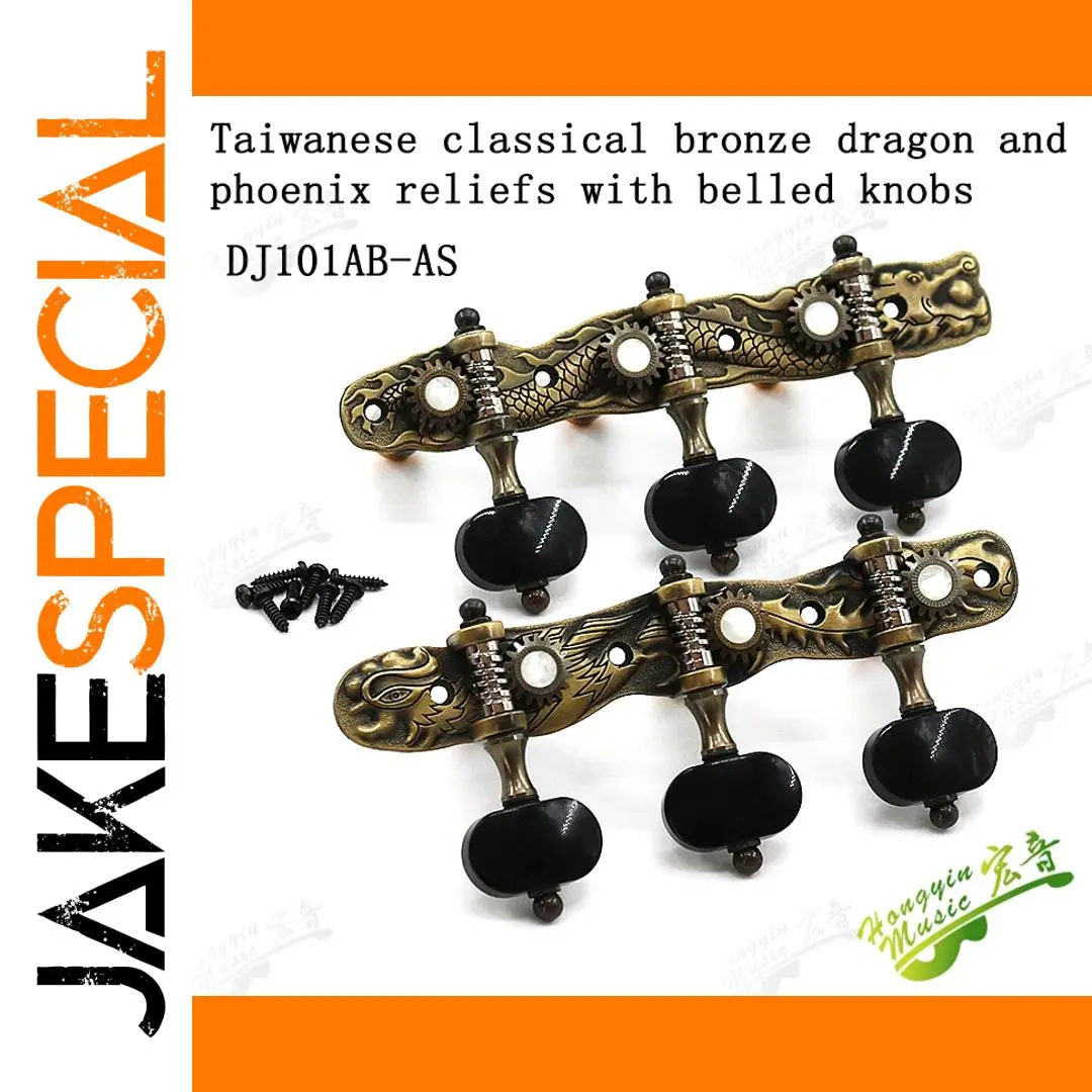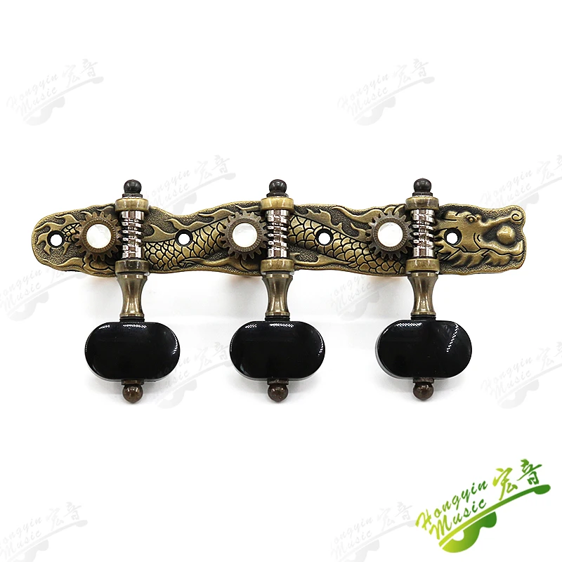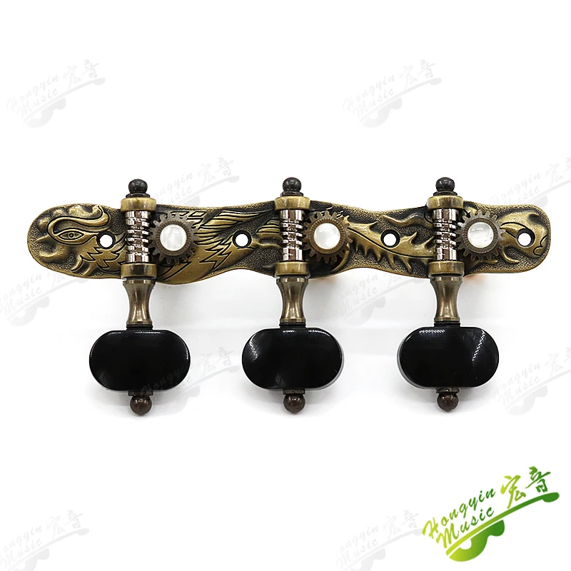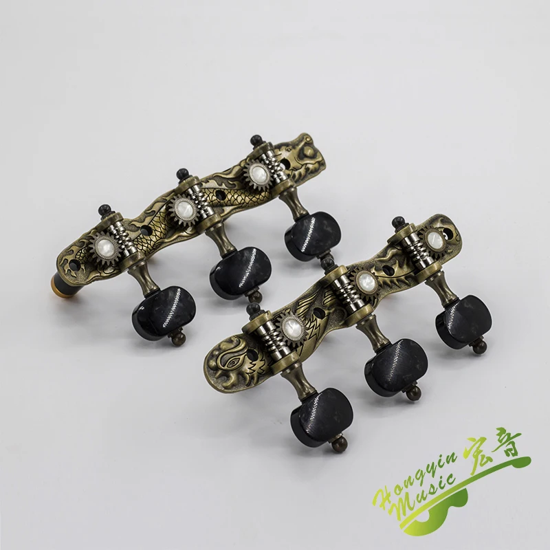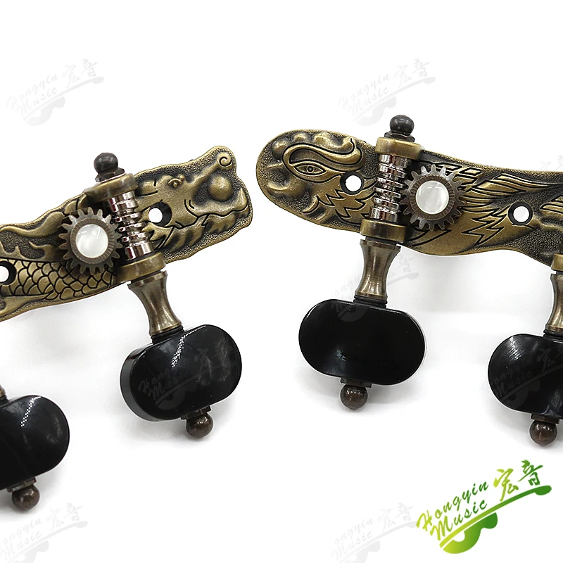 Experience the perfect blend of artistry and craftsmanship with this set of classical guitar tuning pegs. Crafted from durable alloy, these tuners boast a warm bronze finish, intricately detailed with mythological reliefs of dragons and phoenixes that evoke a sense of tradition and elegance. The black, smooth tuning knobs contrast beautifully with the ornate metalwork, providing both aesthetic appeal and easy handling. Designed for high-end classical guitars, these tuners fit guitars with a 10 mm string hole and feature a 1:18 gear ratio for precise tuning. Including both left- and right-hand pegs, this set offers a luxurious upgrade that will enhance your instrument’s appearance and performance.