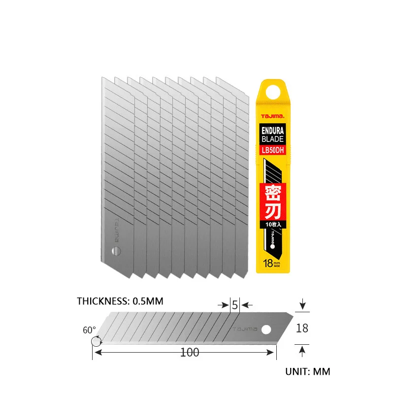Experience effortless cutting with this high-quality Tajima LB50DH double snap-off blade set. Designed for precision and durability, these blades are perfect for utility knives and art cutters, ensuring clean, accurate cuts every time. Crafted from SK120 tool steel with a sleek silver Endura finish, these blades excel in household, DIY, and professional projects. The set contains 10 blades, each measuring 100mm in length, 18mm in width, and 0.5mm thick, providing long-lasting use. Their L-type design enhances safety and handling, making your cutting tasks easier. Whether you're trimming, carving, or crafting, these blades deliver excellent performance. Invest in this reliable blade set for smooth, precision cuts, and enjoy the satisfaction of quality craftsmanship.