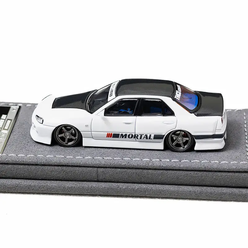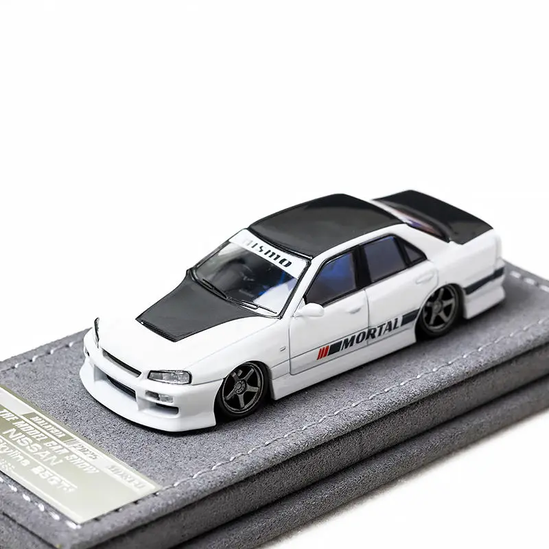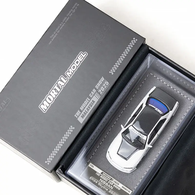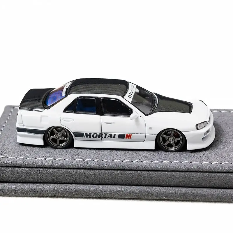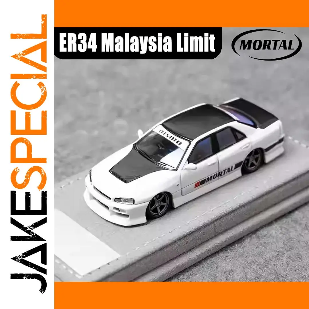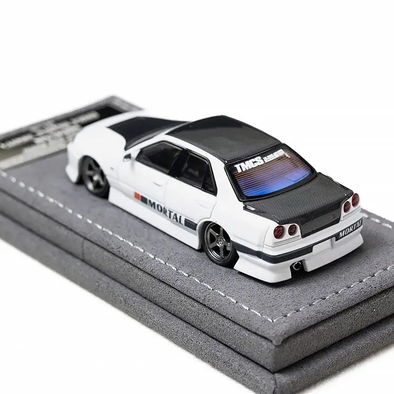 This meticulously crafted 1:64 scale die-cast model car by Takara Tomy features a sleek white body with a textured black carbon cover on the hood, accented by a black roof and multi-spoke alloy wheels. The detailed design includes bold black “MORTAL” branding, red and black graphic accents on the sides, tinted dark windows, and “GULLS CLUB” lettering on the windshield, capturing a sporty and realistic aesthetic. Made from high-quality metal, this non-electric collectible emphasizes realism and craftsmanship, perfect for enthusiasts and adult collectors who appreciate precision detailing and dynamic styling in a limited edition Malaysia ER34 model.
